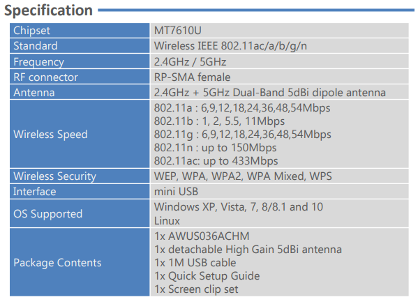 - Чип - MT7610U.