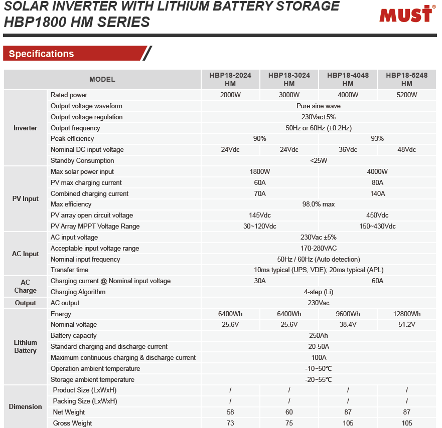 Система хранения электроэнергии MUST НВР18-3024 НМ MPPT LiFePО4 (АКБ с инвертором)