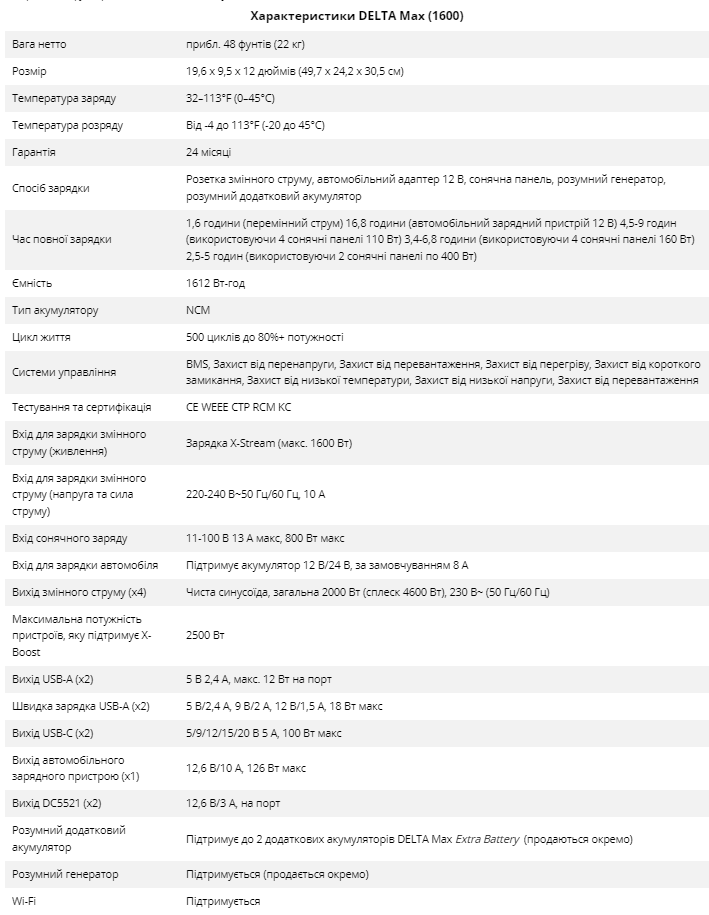 Может заряжаться от солнца, автомобиля, умного генератора; предусмотрено подключение до двух дополнительных акб (тип смотрите ниже в таблице); поддерживает Wi-Fi.