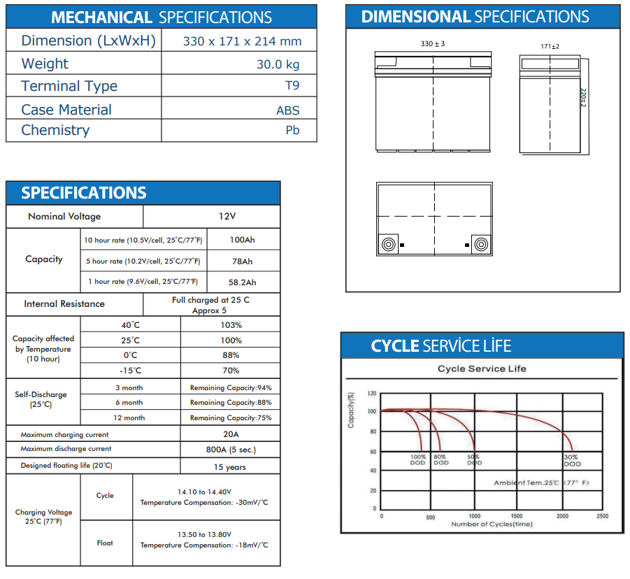 30 кг, 100 Ач, 12-вольтовый стандарт - внешний аккумулятор для циклической работы в ИБП, малых солнечных станциях (ток заряда 10 А), на лодках. Может обеспечить работу котла отопления на 8-10 часов с учетом, что для полной зарядки нужно такое же время.