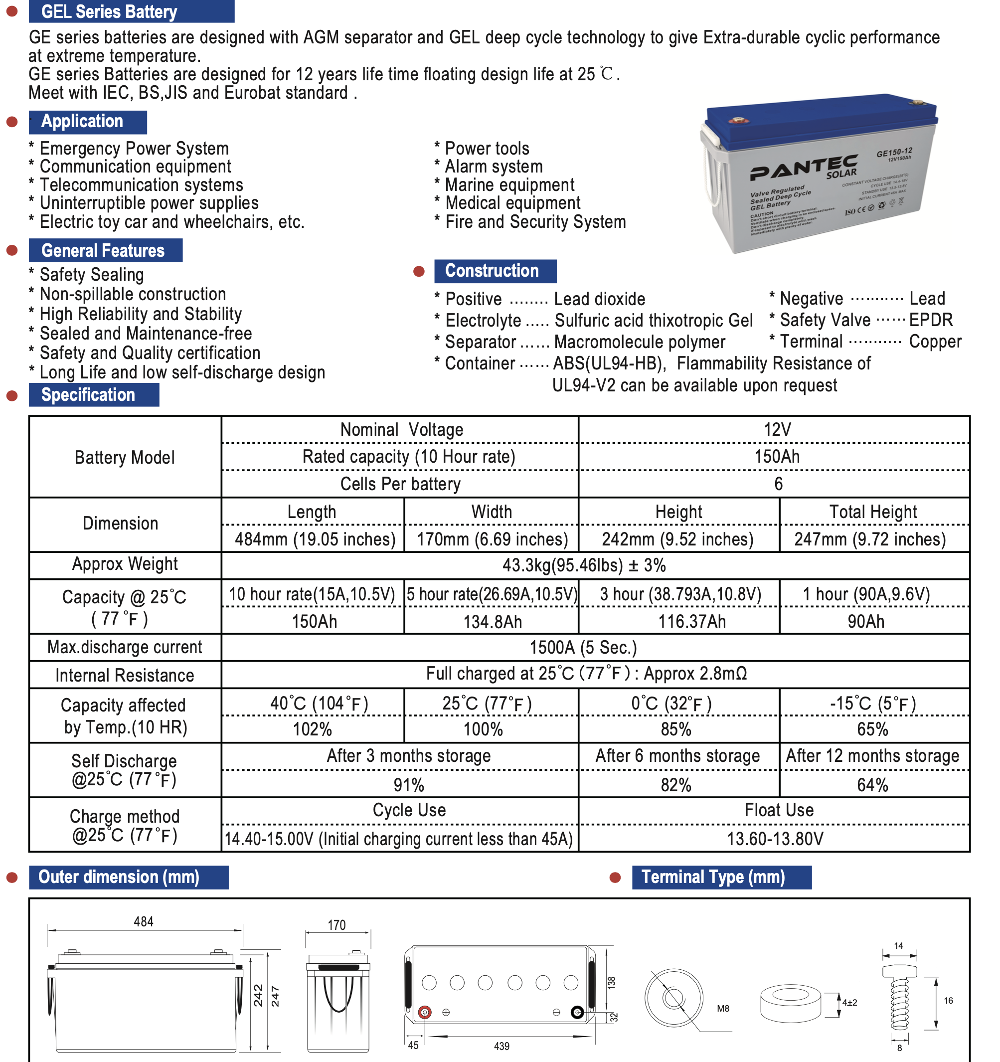 - GE-150 акб GEL-типа 12-вольтового стандарта (марка PANTEC)