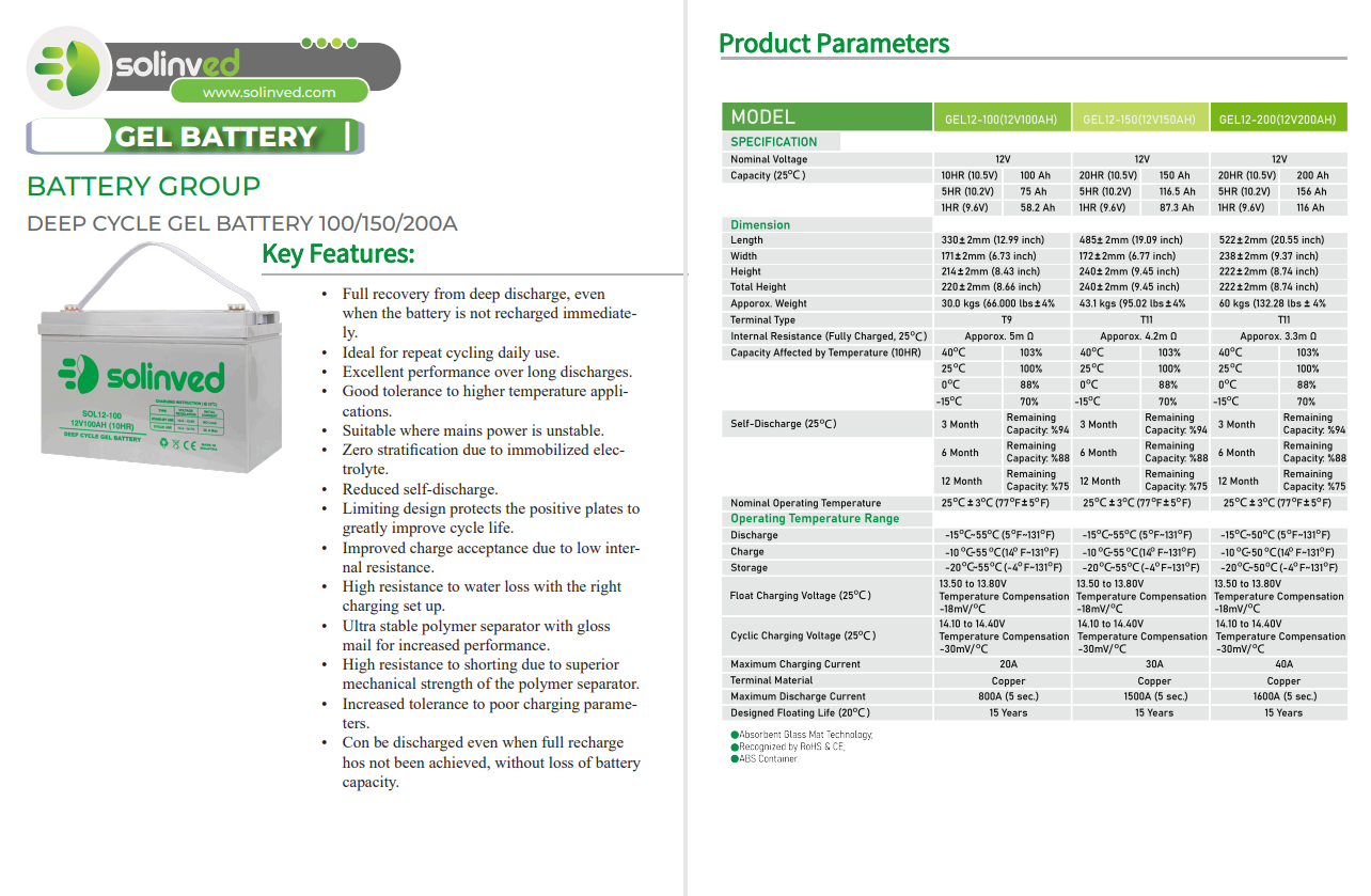 Эта модель относится к категории VRLA-аккумуляторов с гелевым электролитом, что обеспечивает длительный срок службы и высокую устойчивость к глубоким разрядам. Отсутствие необходимости в обслуживании делает аккумулятор удобным выбором как для домашних солнечных систем, так и для телекоммуникационного, промышленного и ИБП-оборудования. SOL12-100 (GEL) стабильно работает в широком диапазоне температур, устойчив к вибрациям и способен выдерживать продолжительные циклы разряд-заряд без потери ёмкости.