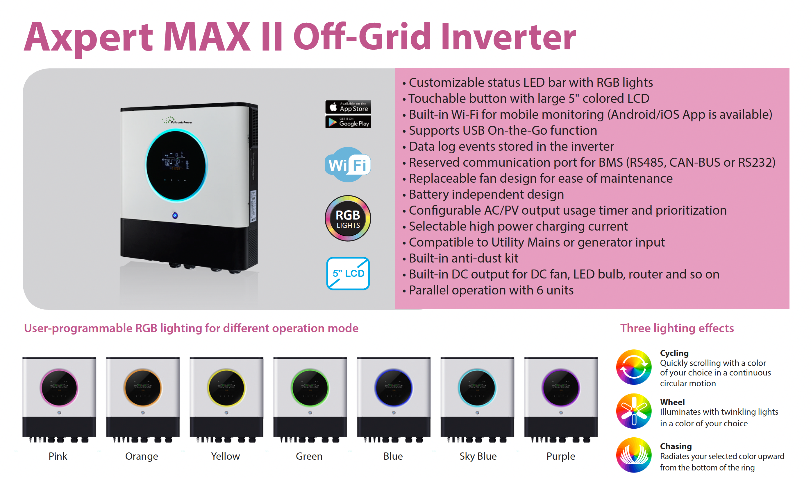 Автономный инвертор на 8 кВт выделяется настраиваемой светодиодной панелью статуса с многоцветной RGB-подсветкой, которая позволяет легко отслеживать режимы работы через визуальные индикаторы.