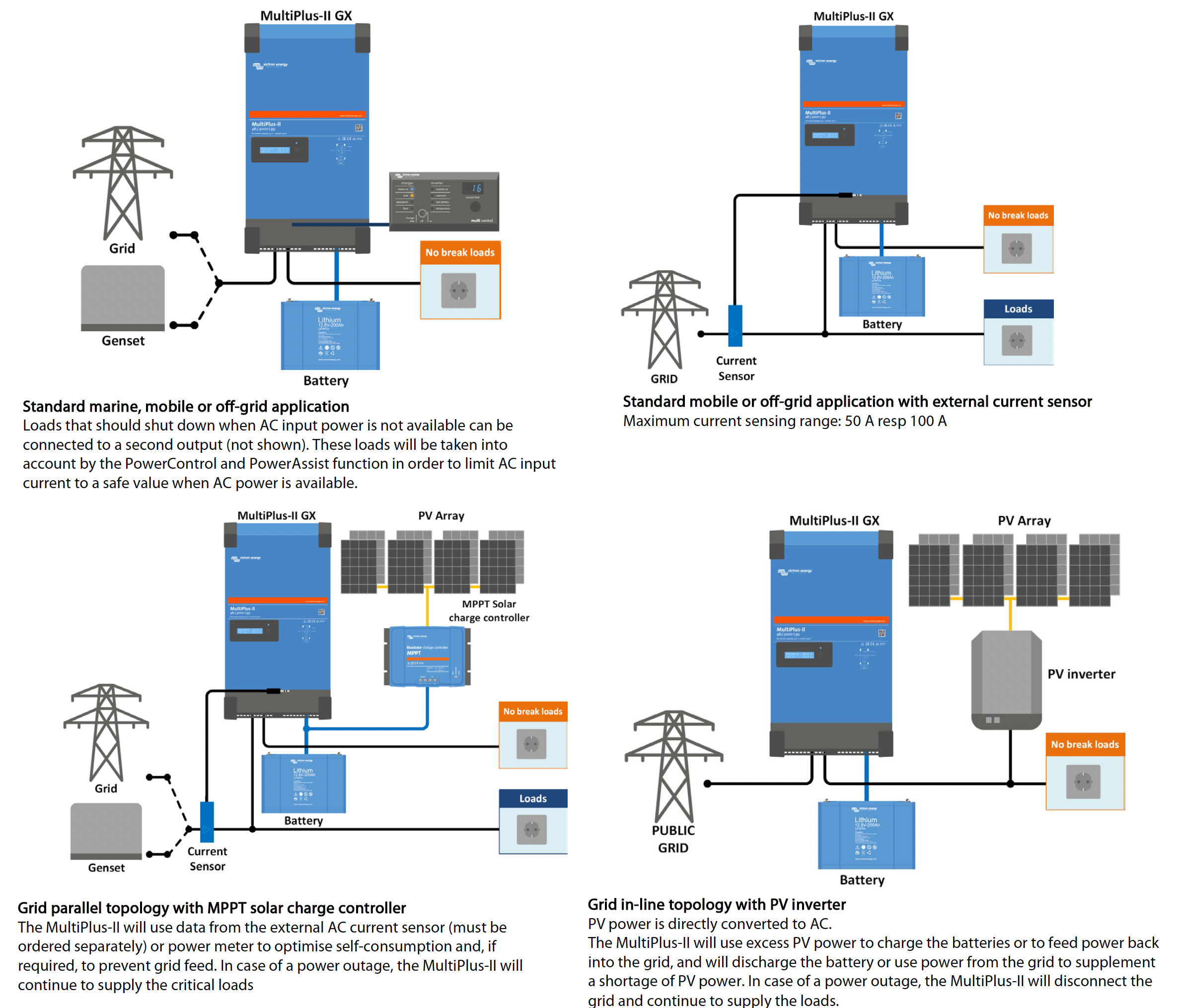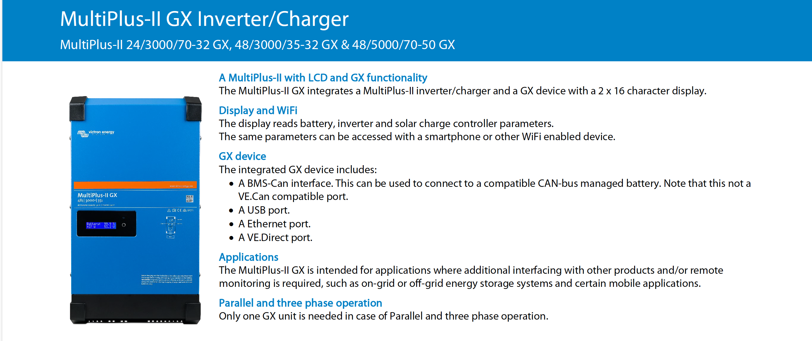 Багатофункціональний перетворювач MultiPlus-II GX поєднує інвертор, зарядний пристрій і GX-модуль із дисплеєм для контролю енергосистеми. Цей прилад розроблений для стабільного енергопостачання в автономних, мережевих і мобільних умовах, наприклад, у будинках, на яхтах чи в кемперах. Він гарантує безперебійну роботу ключових пристроїв під час збоїв у мережі та підтримує керування через мобільний додаток.