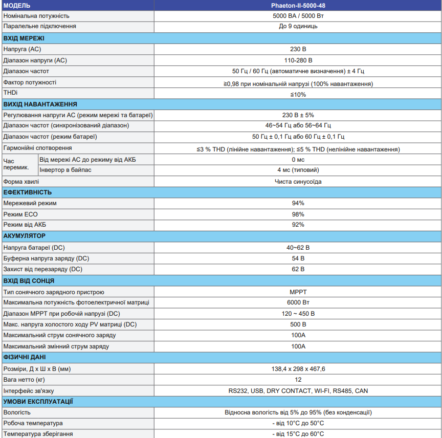 Автономний 5-кіловатний інвертор з нульовим часом перемикання, з'ємним РК-модулем, WI-FI, пріоритетом входу та зарезервованим портом для BMS. Є вибір високої струмозарядної потужності та можливість роботи в паралелі з коробки.