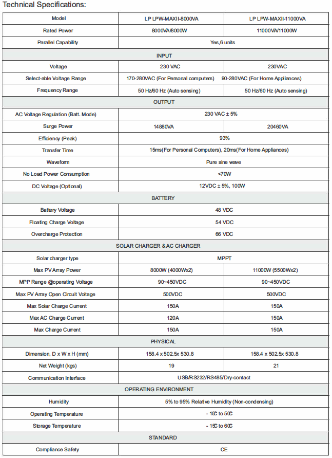 11 кВт, 1 фаза, 2 роки гарантії - інвертор-гібрид з можливістю паралельного підключення до 6 одиниць. Складається з сонячного МРРТ-зарядного та зарядного для акб, забезпечує безперебійну подачу живлення для приватного домоволодіння з однофазною розводкою.