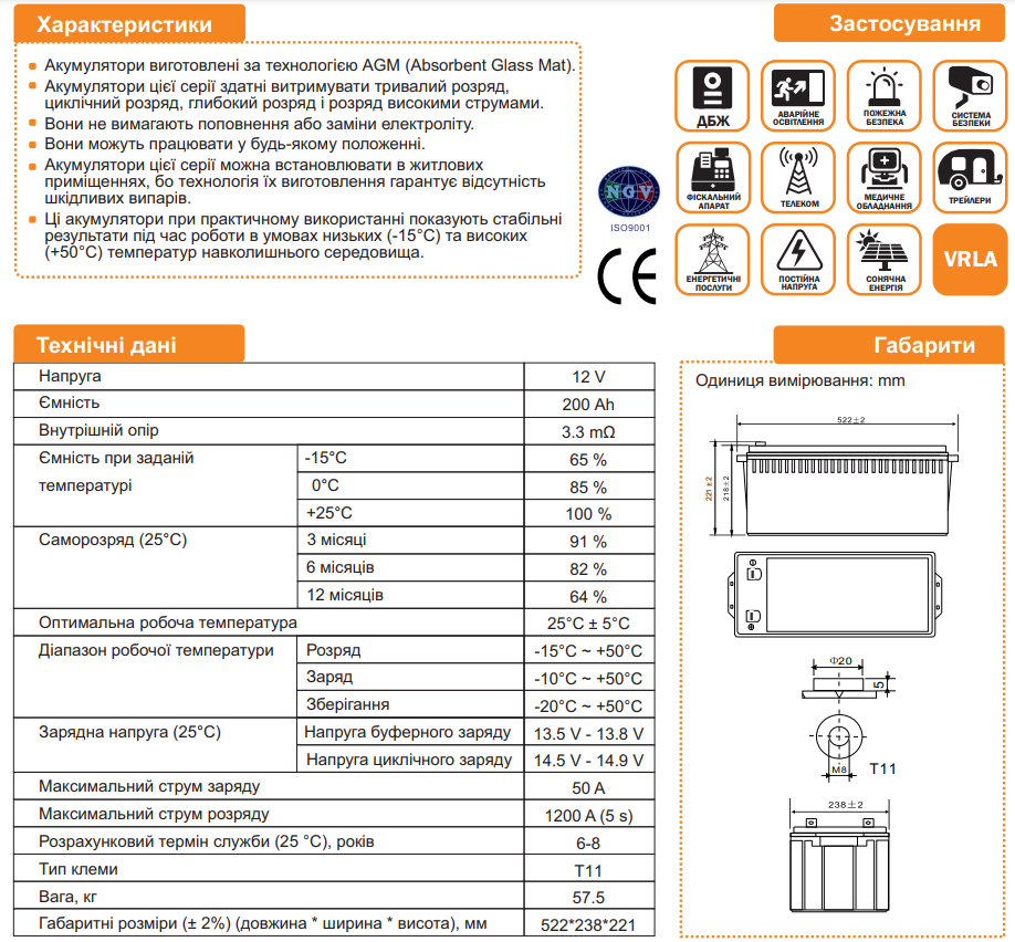 - Ємність: 200 А·год для тривалого енергопостачання.