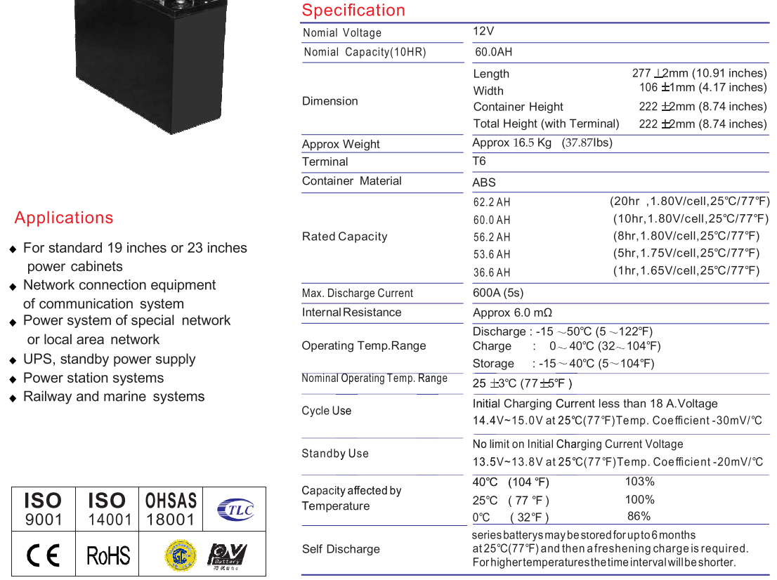 Фронтальні термінали М6, 60 Аг - 12-вольтова батарея з максимальним розрядом 600 А для резервних систем UPS з хорошою ефективністю при низьких температурах (до мінус 15 град. за Цельсієм).