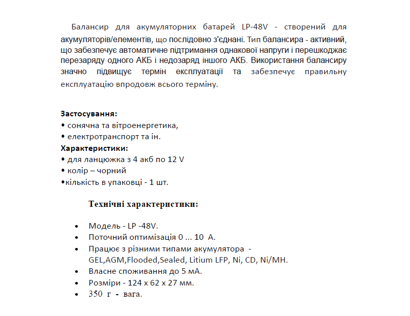 Для чотирьох 12-вольтових акумуляторів - активний балансир, який можна застосовувати на невеликих (домашніх) сонячних станціях або на електротранспорті. Вирівнює напругу, покращує ефективність системи, продовжує працездатність батарей.