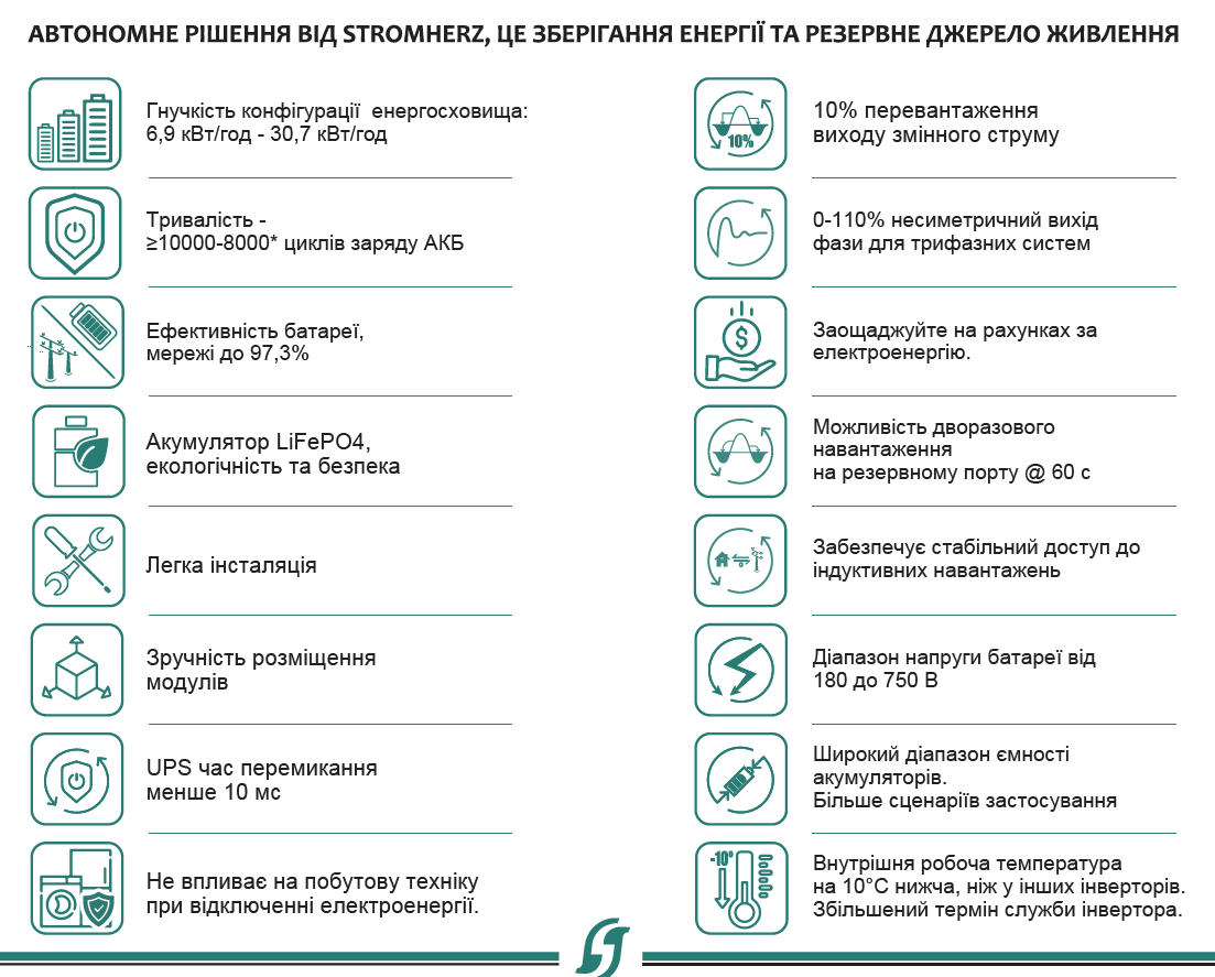 15 кВт, гібрид-інвертор для комплектації системи Stromherz, яка енергію сонця перетворює в електрику. Забезпечує 10 % перевантаження, а також гнучкість масштабування сховища від 6.9 до 30.7 кВт.