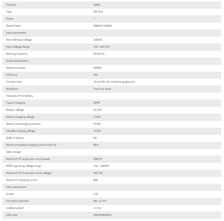 Qoltec 3KVA 2.4KW 80A MPPT Sinus