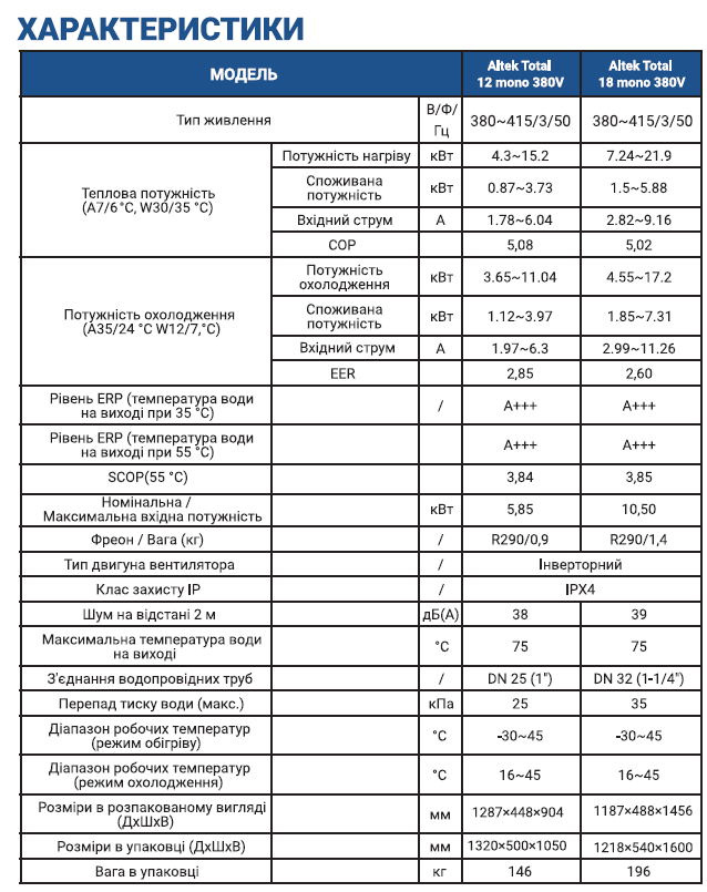 Багатофункціональний тепловий насос-моноблок, який працює від трьох фаз, виробляє 15.2 кВт по теплу при СОР 5.08 та 11.04 кВт по охолодженню при EER 2.85. Має інверторний електропривід,