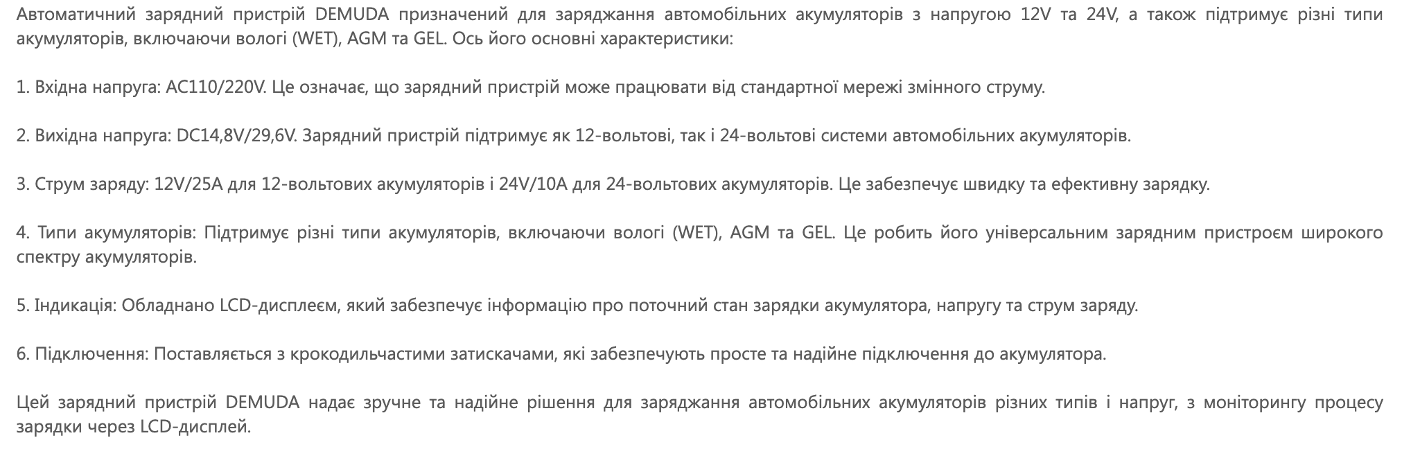 Струм  процесу  заряджання  до  25  А  -  пристрій  автоматичний,  зарядний,  з  дисплеєм,  комплексним  охолодженням  та  наявністю  шести  видів  захисту.  Сам  визначає  стандарт  напруги  батарей,  інформує  про  поточні  параметри  заряду.