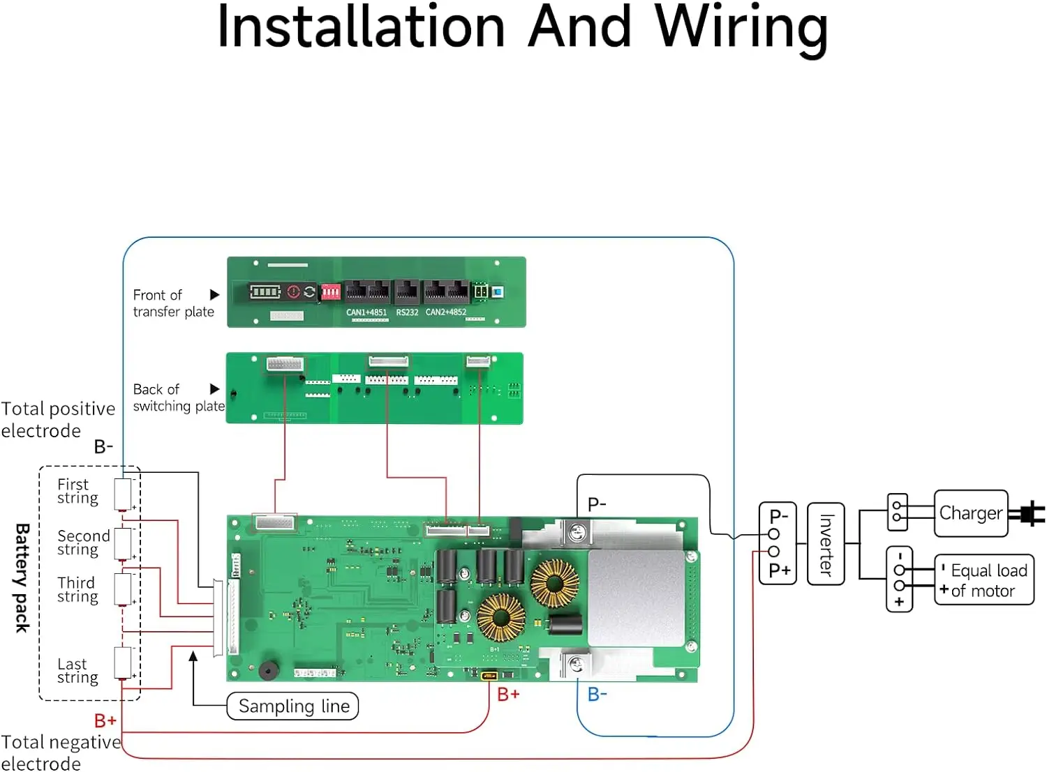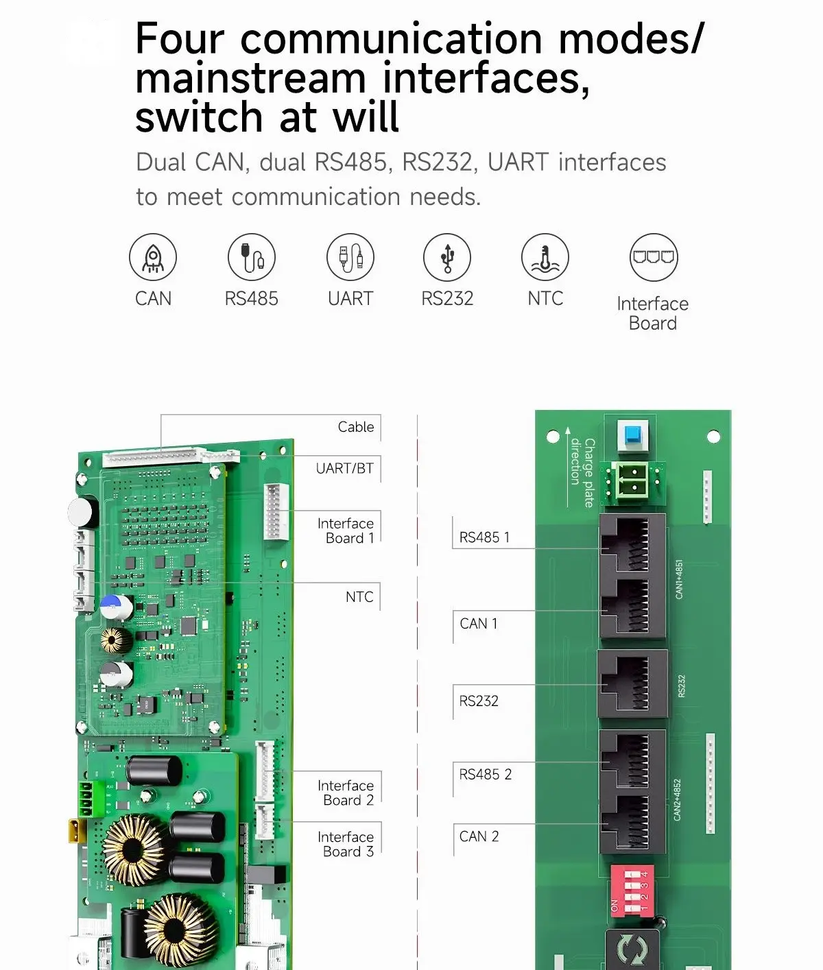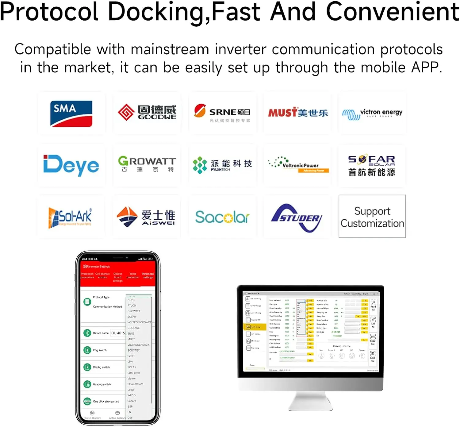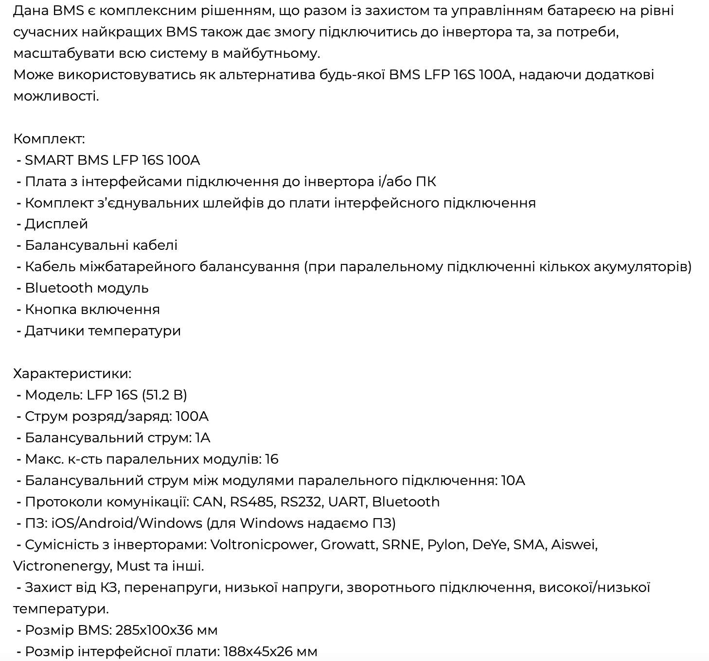 Можливість 16 модулів, 100 А, 51.2 В - плата активного балансування з кабелями, шлейфами, модулем Bluetooth та датчиками температури. Сумісність з 12 найменуваннями інверторів.