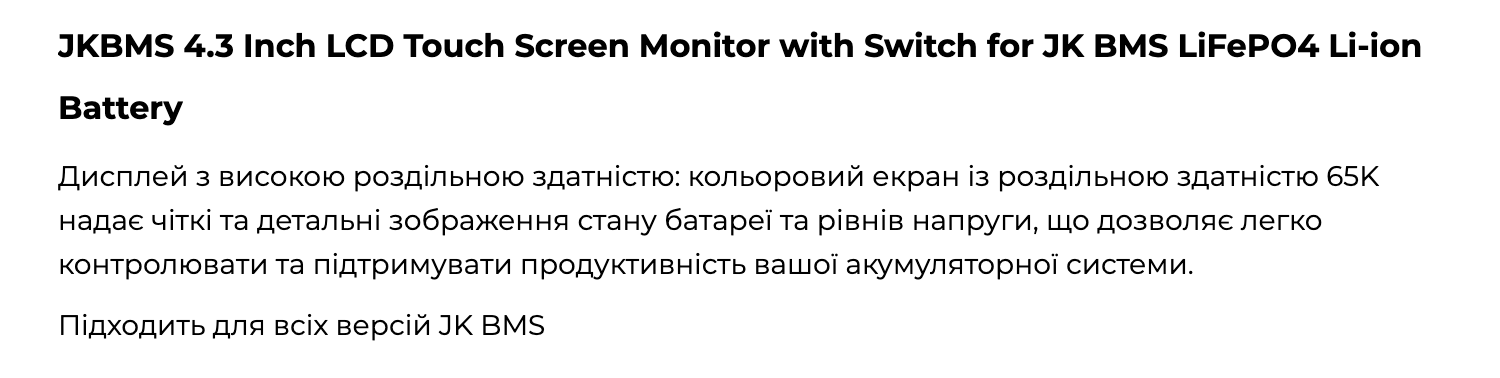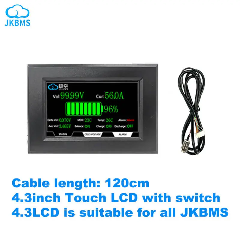 Виносний екран  розміром  діагоналі  4.3  дюйма  для  контролю  LFP-батарей  працює  з  BMS  типу  JK,  визначаючи  похибки  та  показуючи  значення  температури,  струму,  рівня  заряду,  напруги.