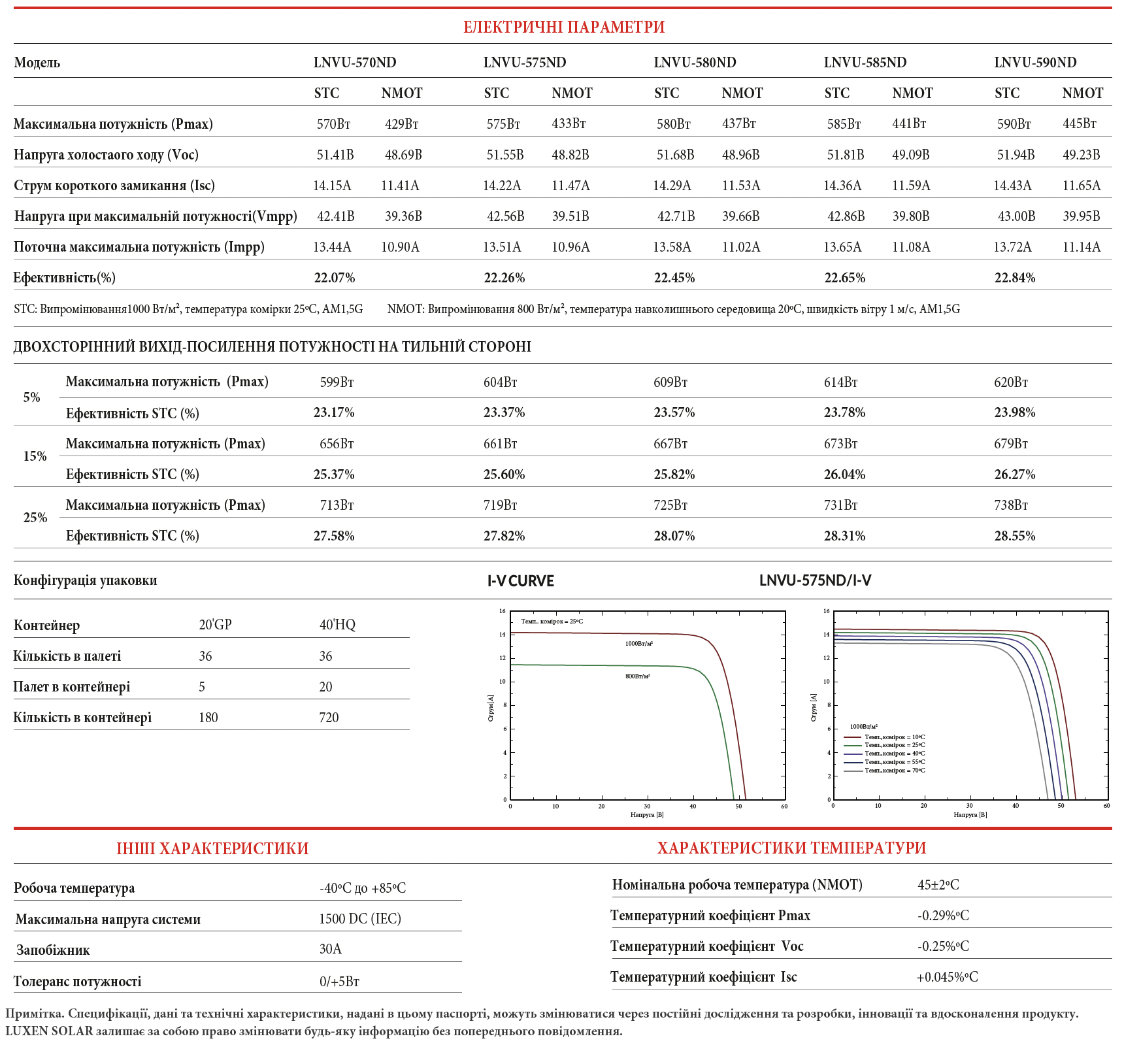 Інформація заводу Luxen про двосторонній сонячний модуль LNVU-580ND: