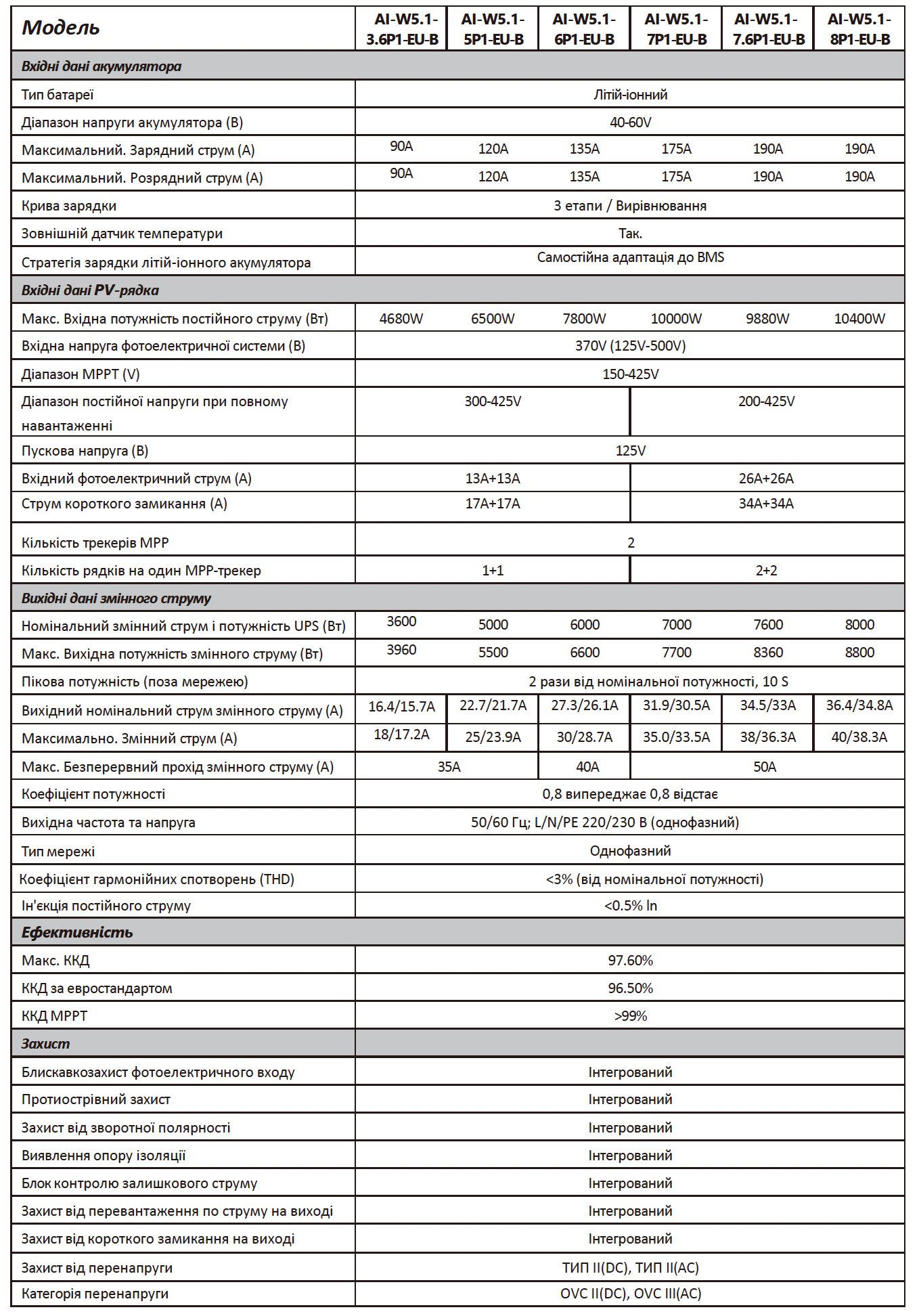 - Одна фаза, 6 000 Вт - вихід.