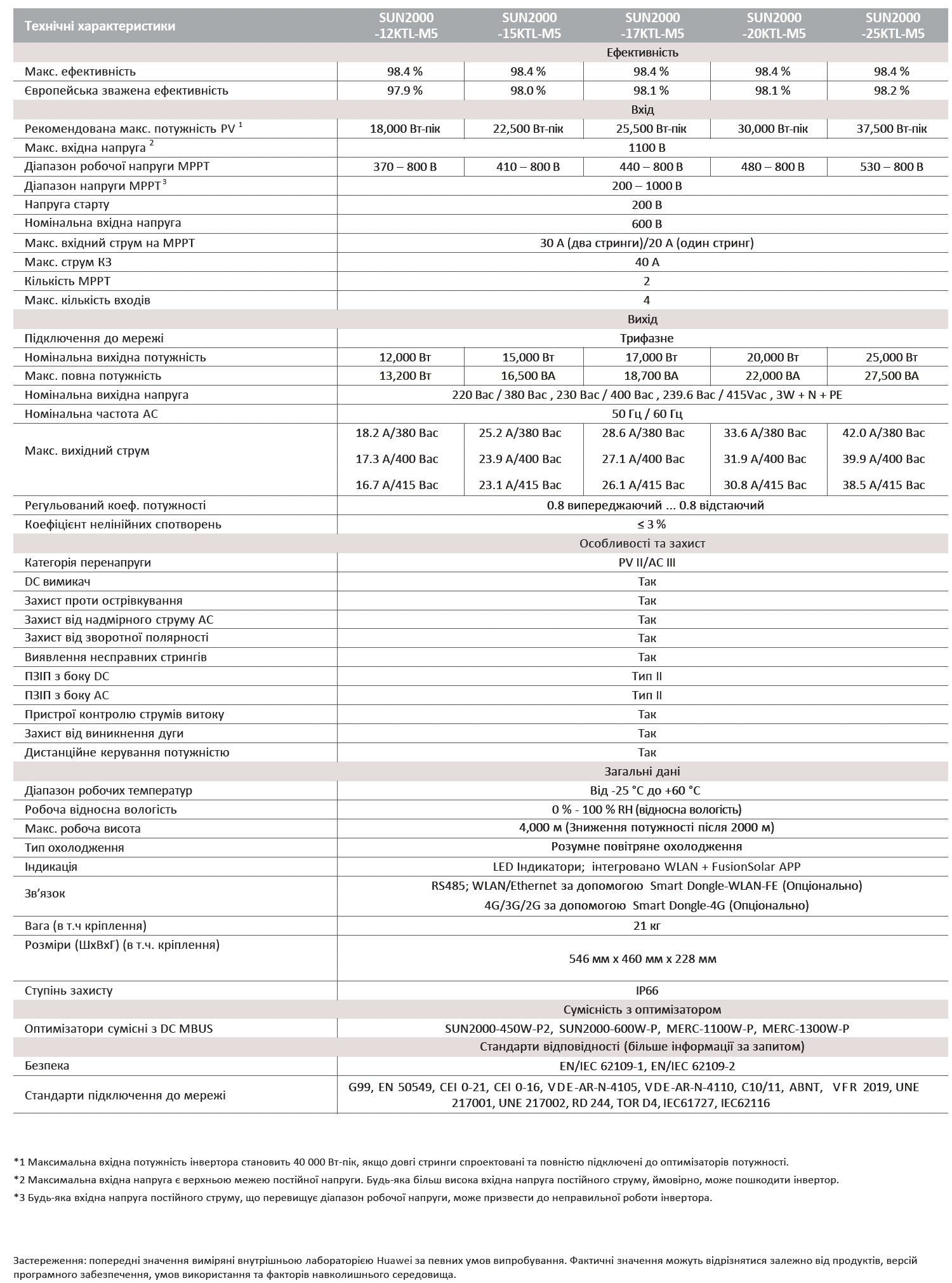Параметри SUN2000-25KTL (модель M5) в подробицях від фірми Huawei:
