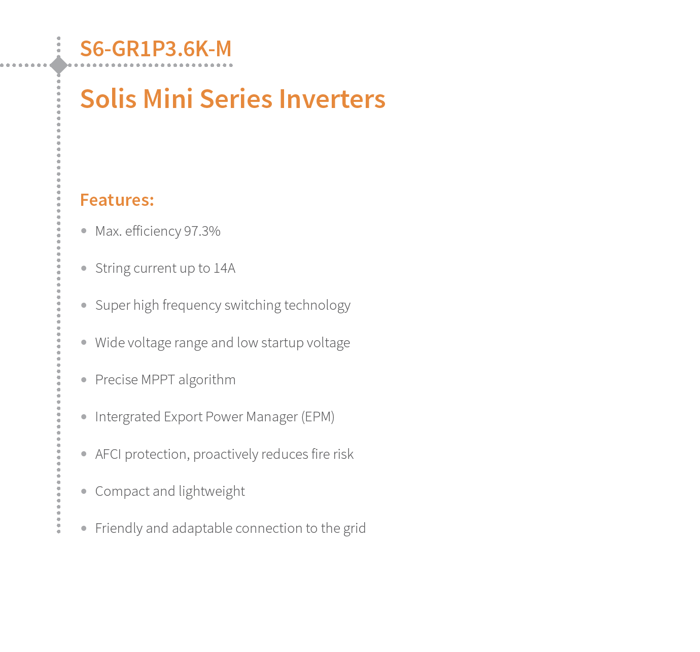 МРРТ-алгоритм, 3.6 кВт, 1 фаза, 2 варіанти частот - мережевий інвертор під станцію з PV-потужністю 5.6 кВт та генератор за необхідності. Відрізняється компактністю, низьким самоспоживанням, низьким шумом та наявністю захисту від дугового замикання.