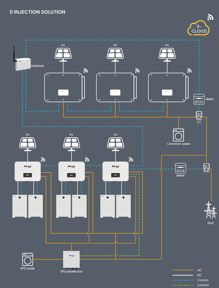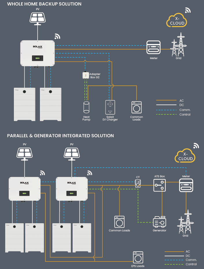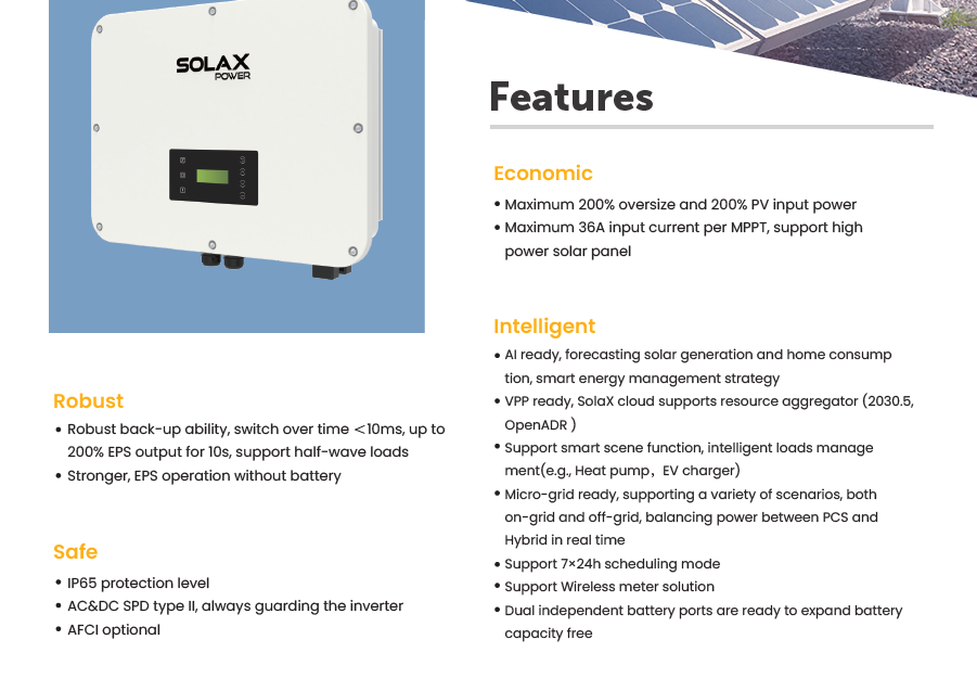 Завдяки інтелектуальній системі керування інвертор оптимізує розподіл енергії, враховуючи прогнози генерації та споживання. Підключення до хмарної платформи SolaX Cloud забезпечує зручний віддалений моніторинг і керування через смартфон чи комп’ютер, що спрощує експлуатацію та дозволяє оперативно реагувати на зміни. Інвертор підтримує роботу з літій-іонними акумуляторами, що робить його гнучким для систем із накопиченням енергії.