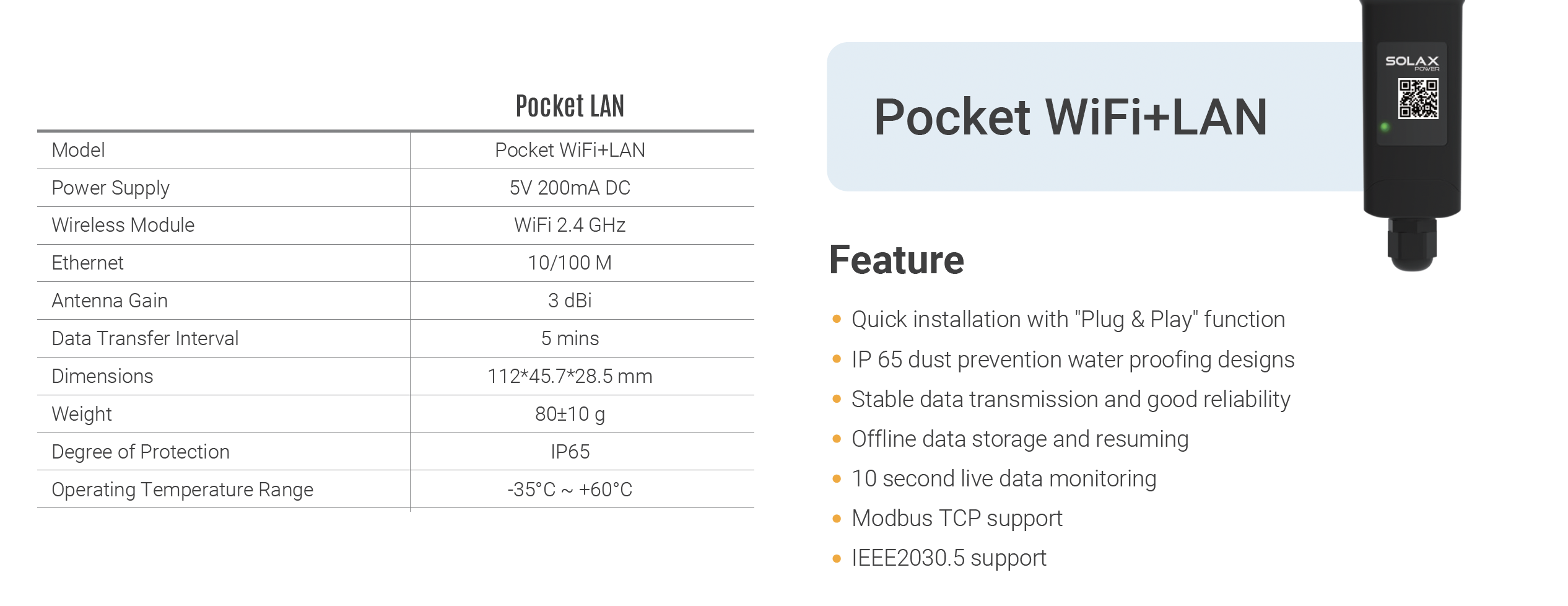Модуль має міцний корпус із захистом від пилу та вологи за стандартом IP65, що робить його стійким до зовнішніх впливів і придатним для використання в різних кліматичних умовах. Компактні розміри та легка вага дозволяють зручно розмістити його поруч із інвертором, не займаючи багато місця. Цей пристрій – ідеальний вибір для тих, хто хоче поєднати надійність дротового та бездротового зв’язку для управління своєю сонячною системою.