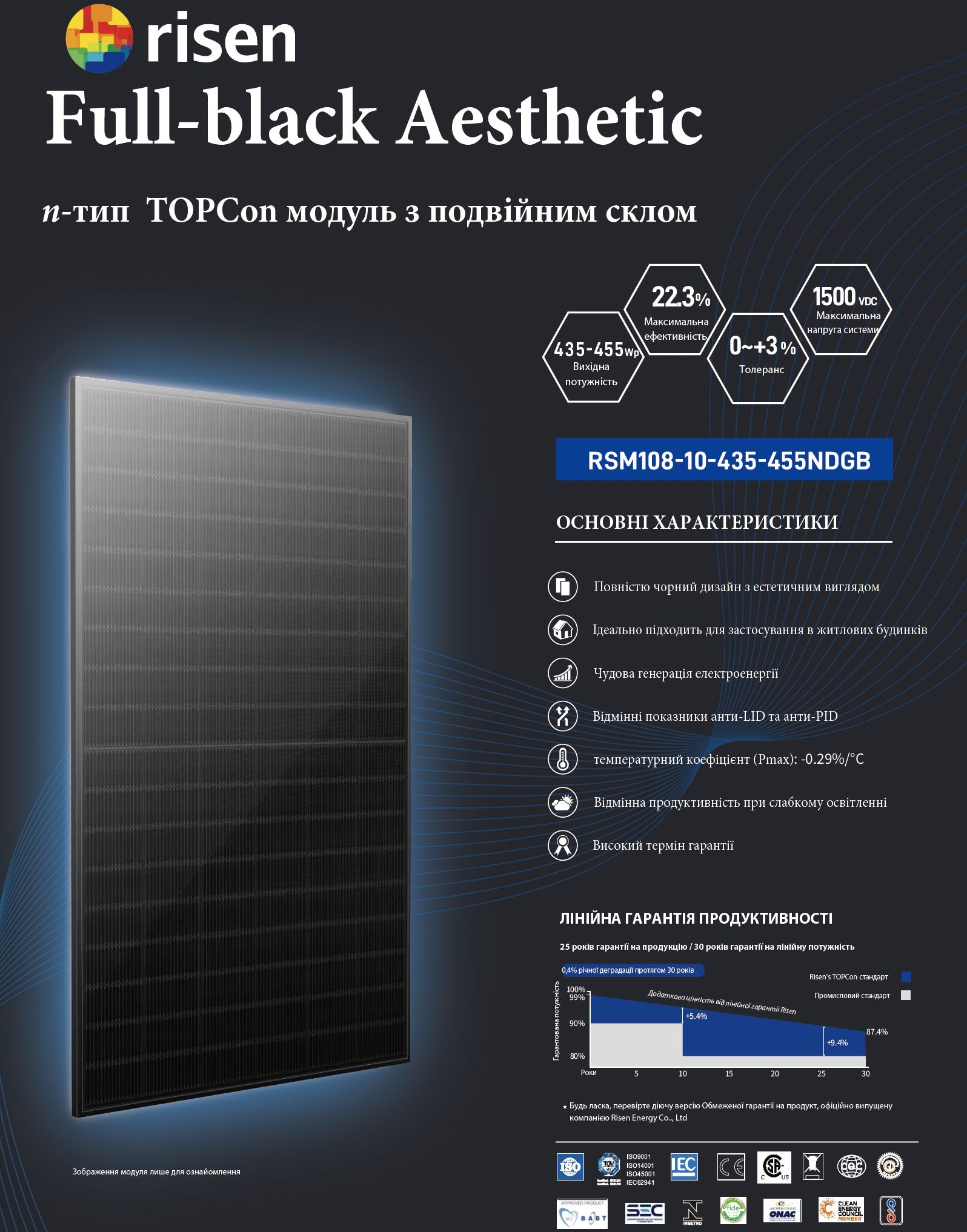 Повністю чорна, оригінальний дизайн – панель марки RSM108-10-435 (версія DGB) на 435 Вт поєднує елегантність та передову технологію для стильних сонячних систем. Подвійне скління підвищує довговічність.