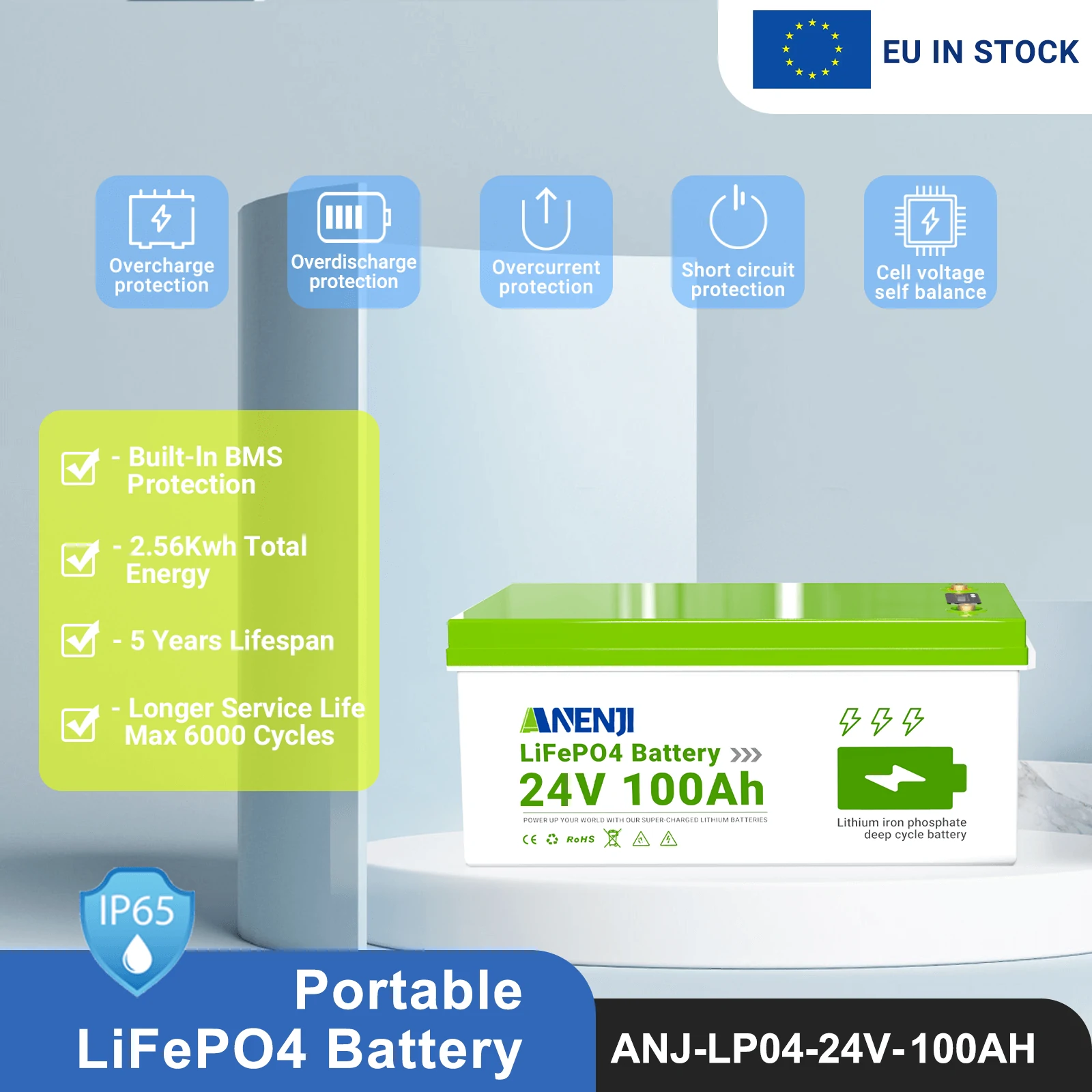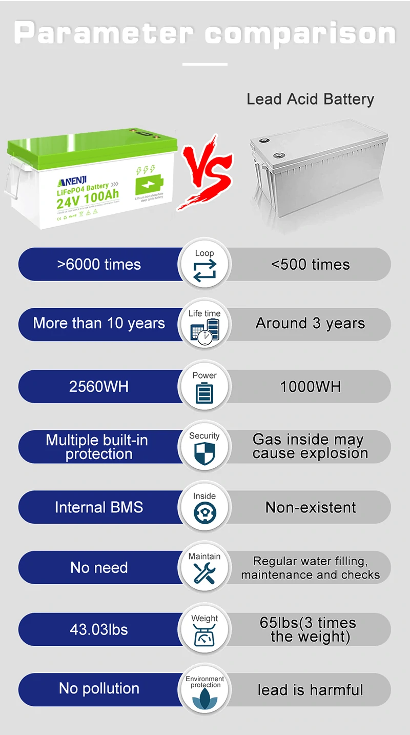 Недорогий акумулятор LFP (марка Anenji, модель ANJ, версія 24V-100AH, індекс PX) оснащений вбудованою BMS, що забезпечує надійний захист у робочому процесі. Цей пристрій розроблено для тривалого та безпечного зберігання енергії у сонячних системах, водному транспорті та резервних джерелах живлення. Завдяки високій щільності енергії та стабільності, акумулятор ідеально підходить для автономних систем.