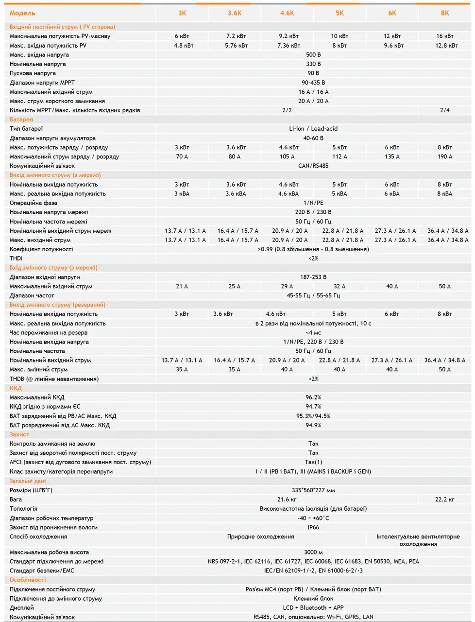 - Макс. вхідна потужність сонячного масиву – 10 кВт.