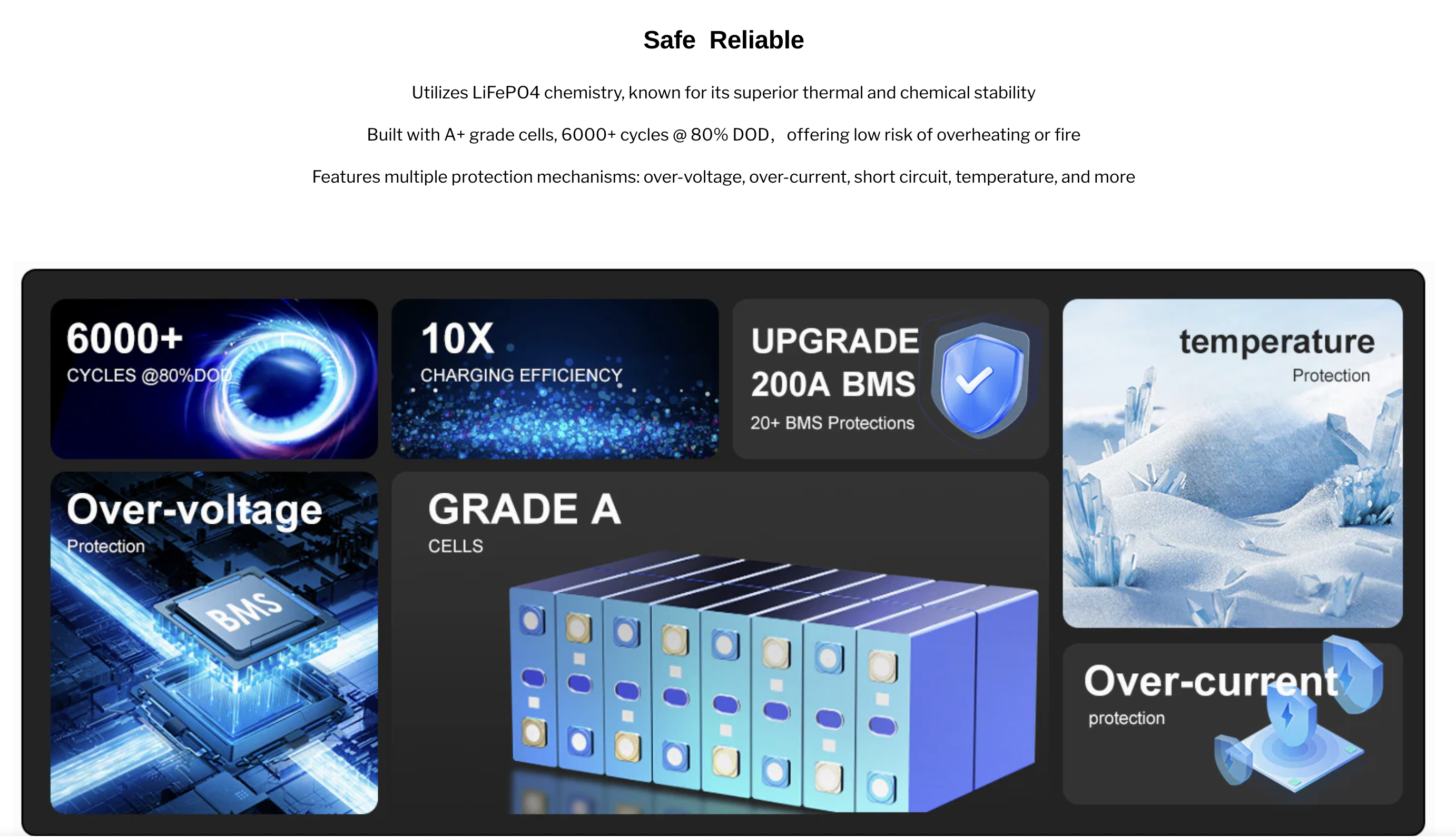 - Кількість циклів життя: не менше 6000 при 80% DOD та 0,2C/0,5C заряд-розряд при 25 °C