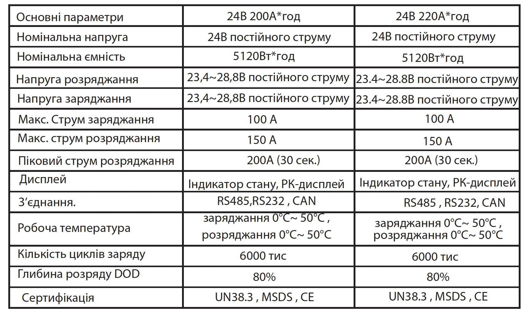 - Ємність батареї: 200 А·год, номінальне енергозбереження 5.12 кВт·год;