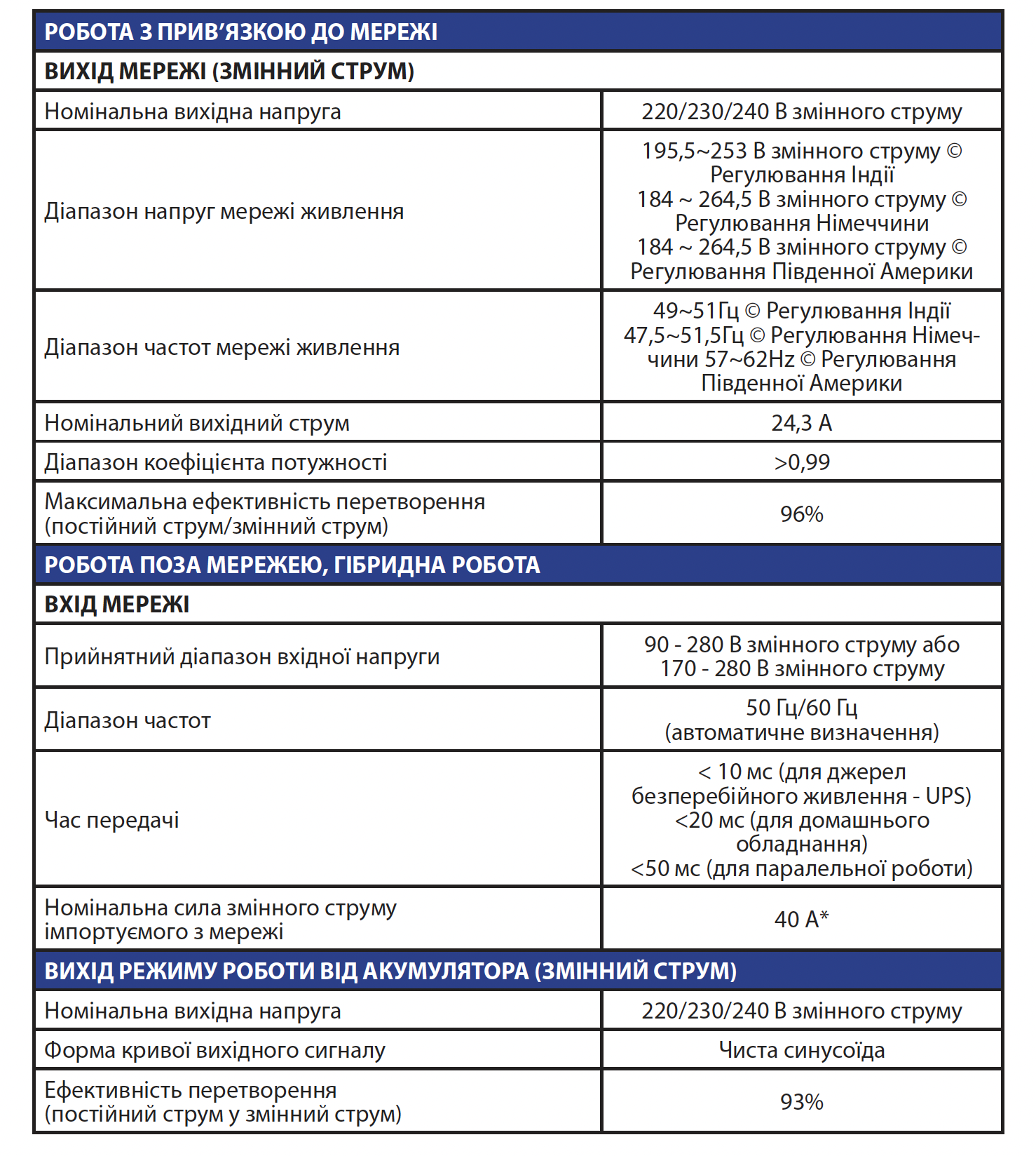 - Режим роботи: мережа/генератор/сонячні панелі/акумулятор.