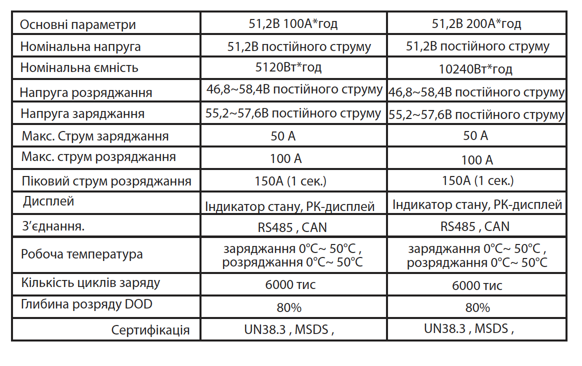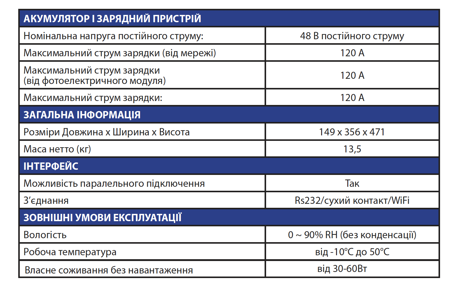 - Струм зарядки від мережі або сонячних панелей - до 120 А;