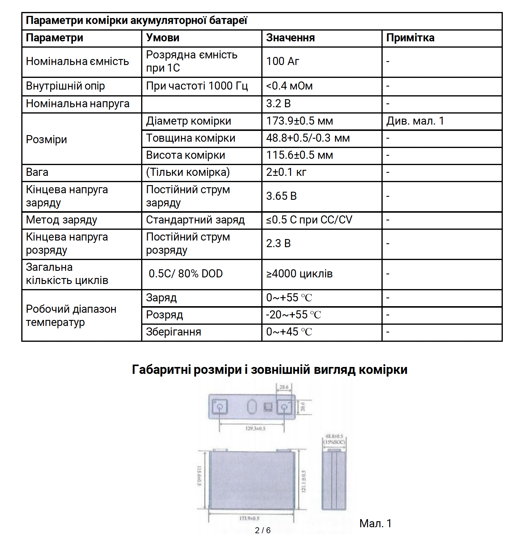 • Внутрішній опір клітини – менше 0,4 міліома при 1000 Гц.