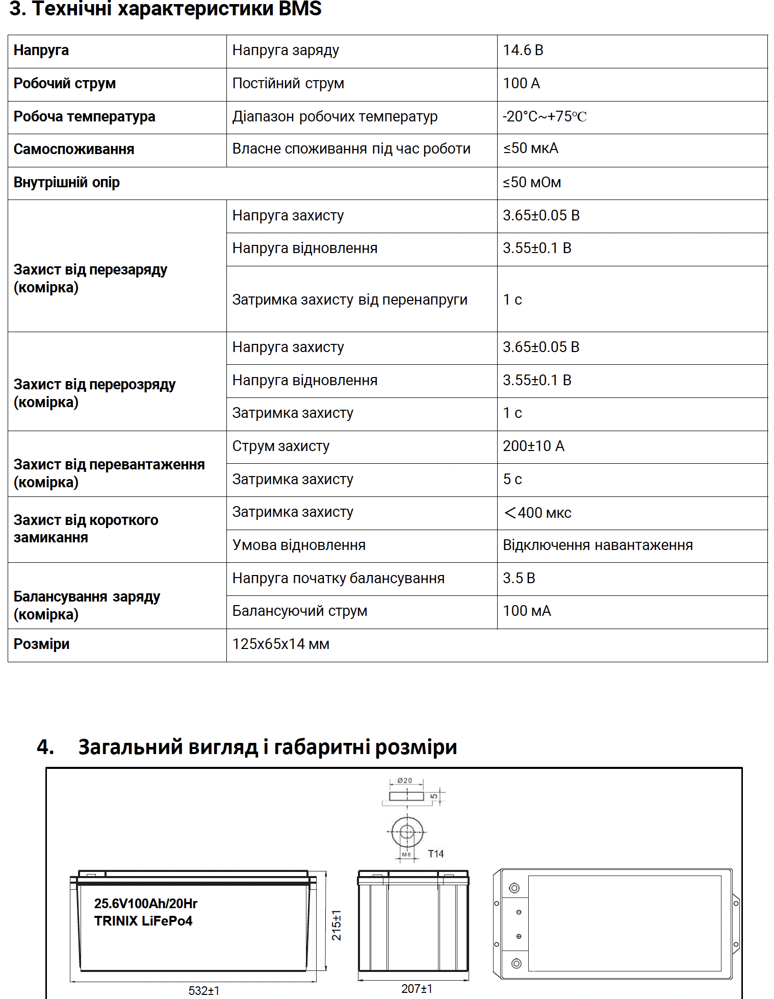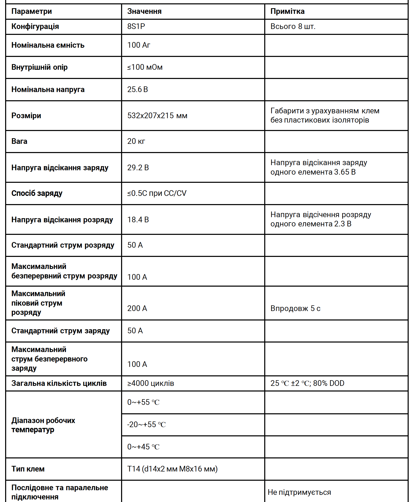 • Тип батареї - LFP, 25.6 В/100 А·год, оптимальний для 24-вольтових систем.