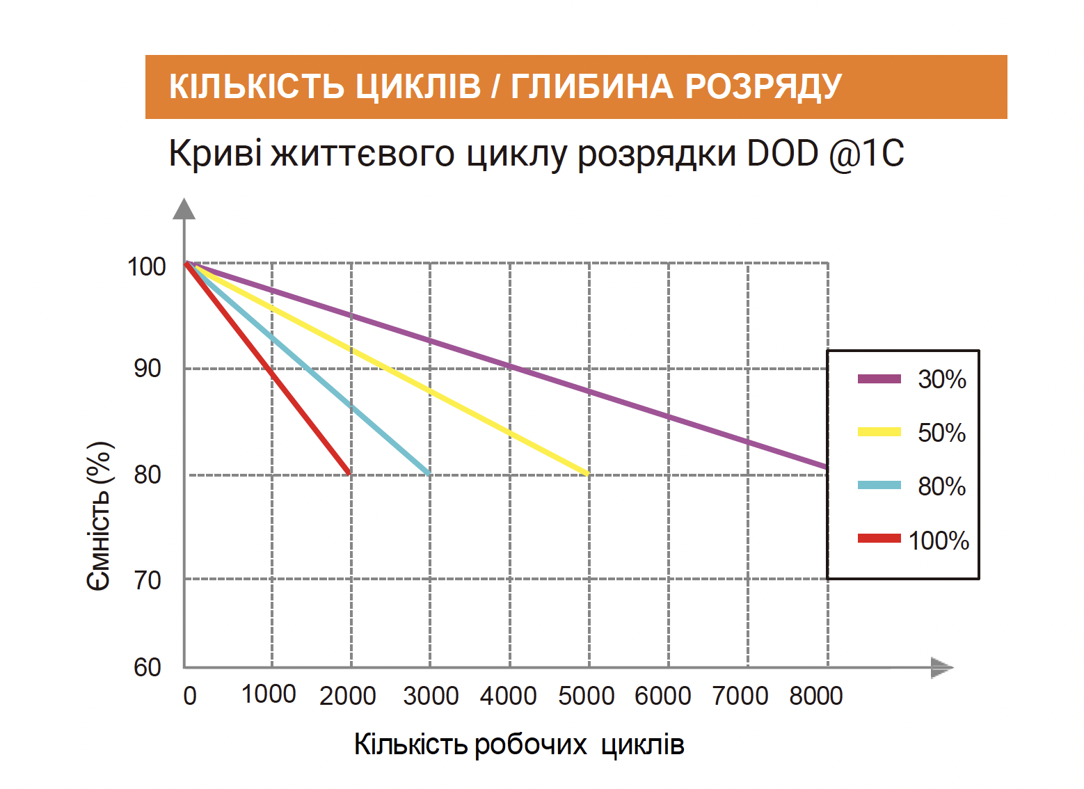 • Загальна кількість циклів ≥4000 при 0,5 °C та 80 % DOD.