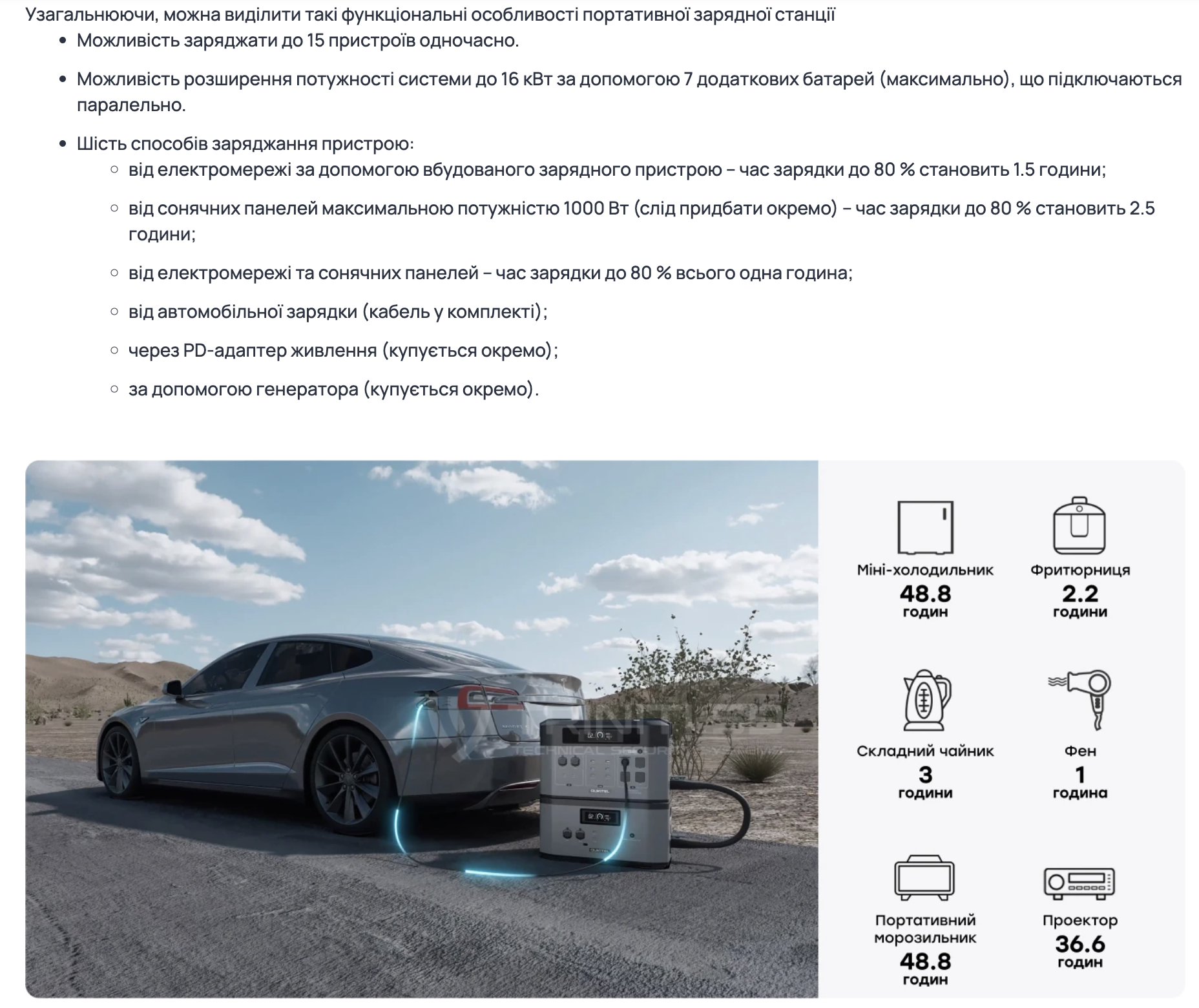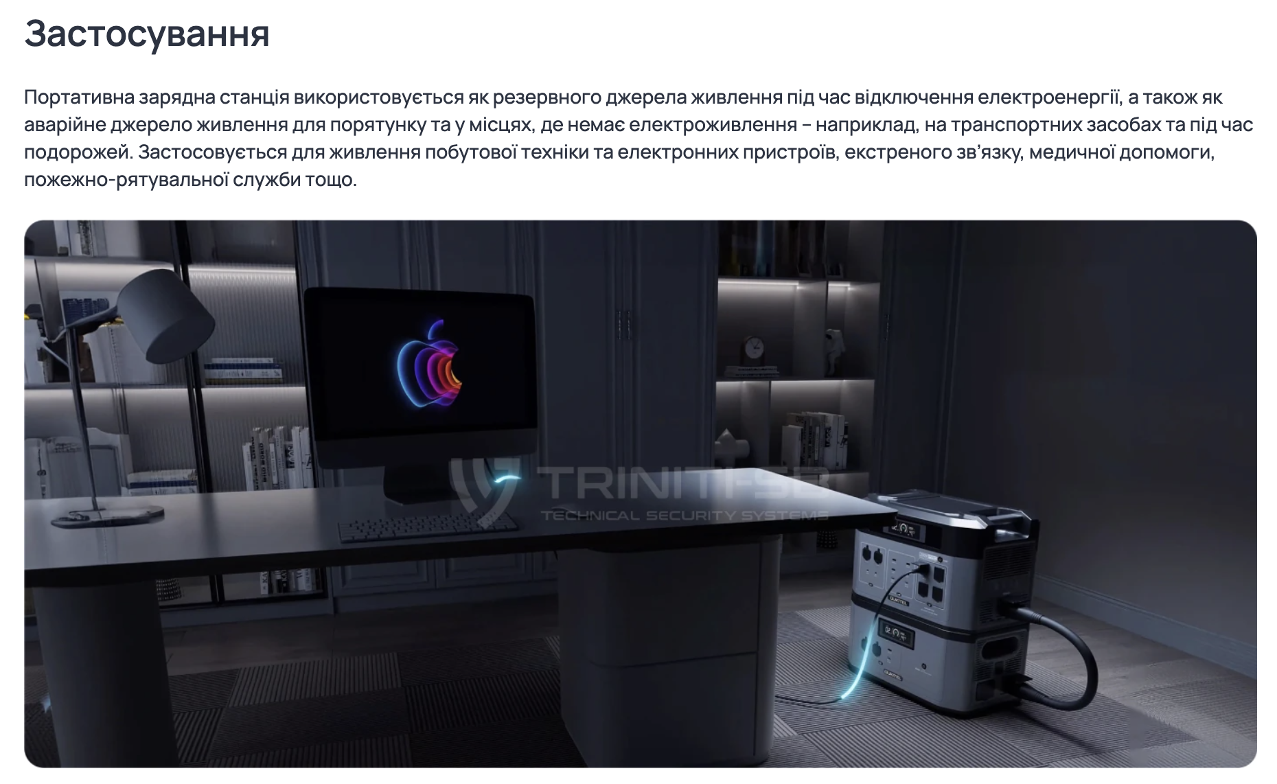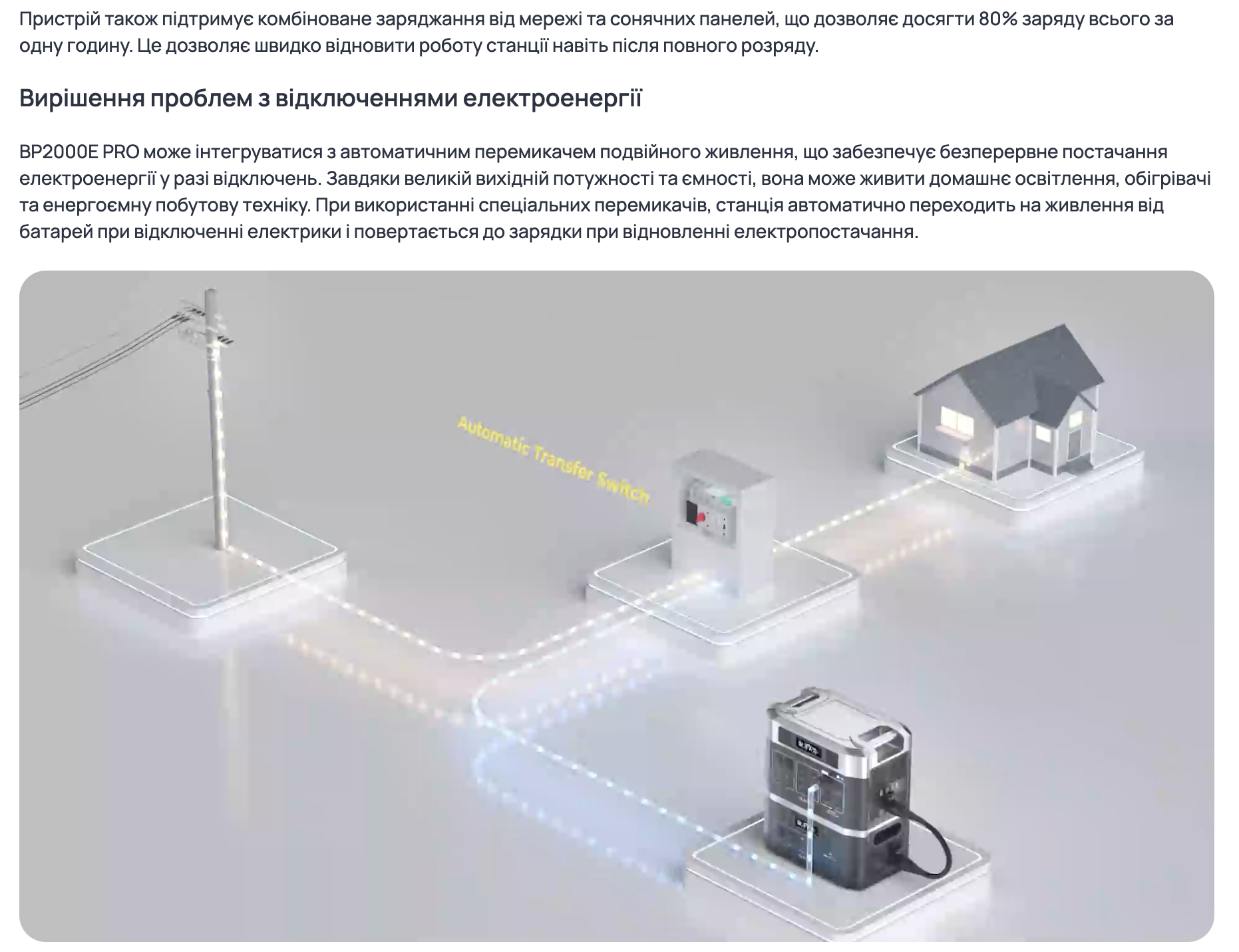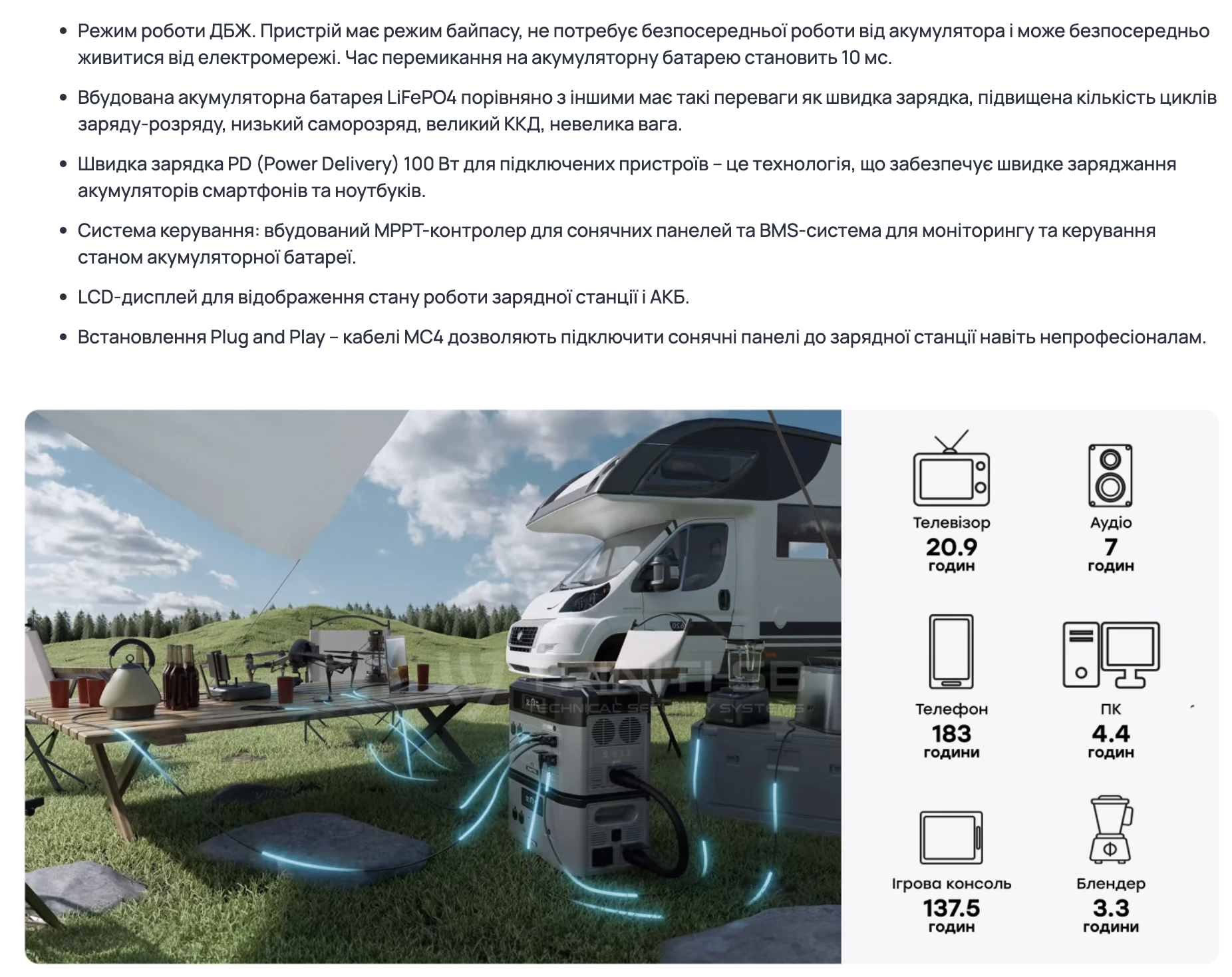 Пристрій поєднує компактність та високу продуктивність, дозволяючи заряджати гаджети від мережі, автомобіля чи сонячних панелей. Завдяки вбудованій батареї на LFP-основі, вона витримує тисячі циклів без втрати ефективності. Функція безперебійного живлення миттєво перемикає навантаження, мінімізуючи простої. Дизайн із безліччю портів робить його універсальним для підключення техніки різного типу.