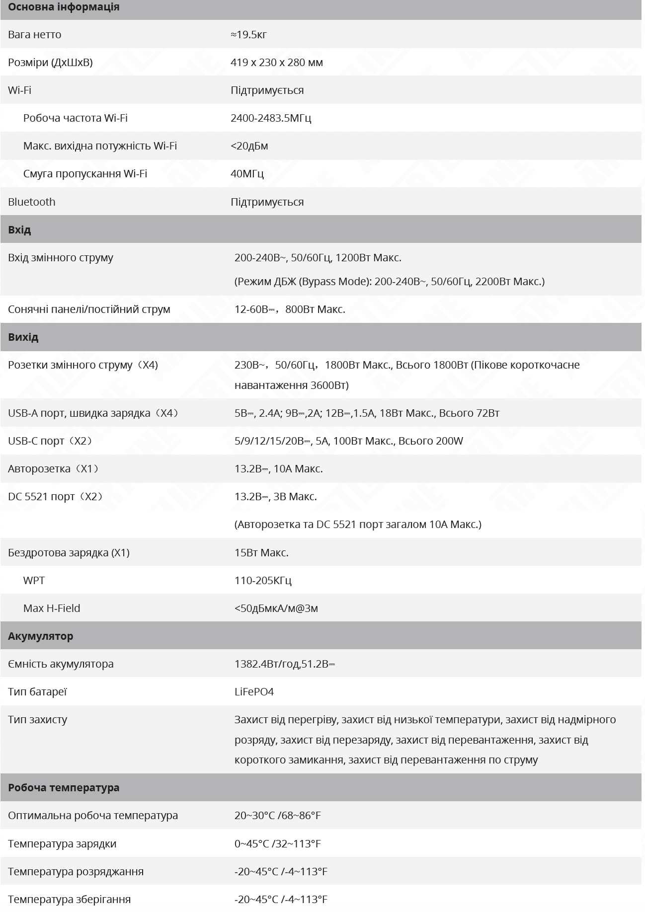 - Вихід AC: чотири розетки на 1800 Вт сумарно.
