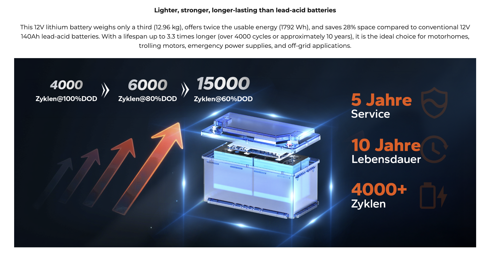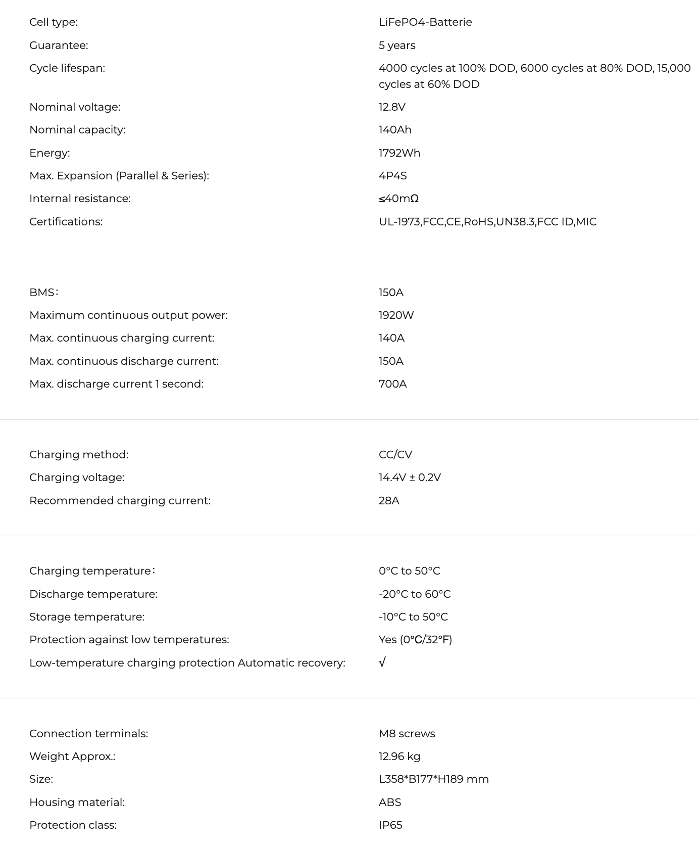 Модель ідеально підходить для автономних систем, де потрібна зимова надійність: від сонячних установок до човнових моторів. Вбудований BMS на 150 ампер охороняє від навантажень, а програма дозволяє відстежувати параметри в реальному часі. Місткість 140 ампер-годин при 12,8 вольтах дає 1792 ват-години енергії, що втричі перевищує свинцеві аналоги за ресурсом. Більше 4000 циклів повної розрядки та десятирічний термін служби роблять її вигідною для кемпінгу чи резервного живлення. Компактний формат H190 (висота 189 мм) вписується в стандартні відсіки, а IP65-захист витримує вологу та пил.