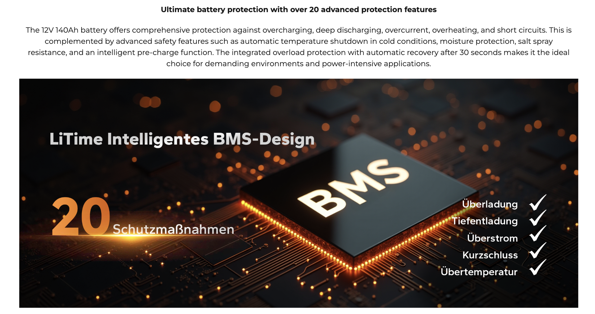- Система BMS на 150 ампер контролює навантаження, короткі замикання та температурні стрибки для повної безпеки.