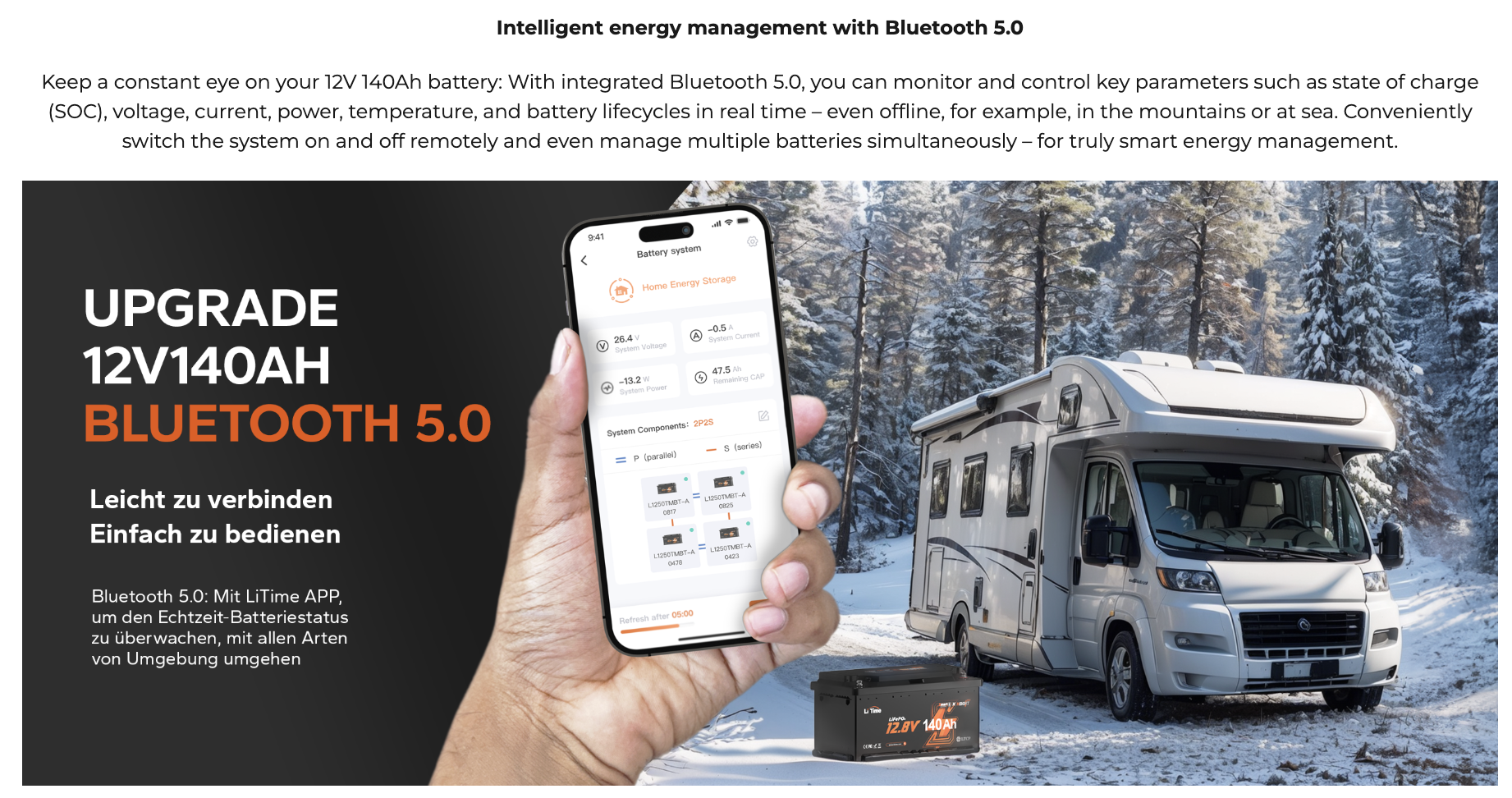 Батарея LFP на 140 Аг з інтелектуальним Bluetooth-моніторингом для холодних умов з автоблокуванням заряду нижче нуля градусів.