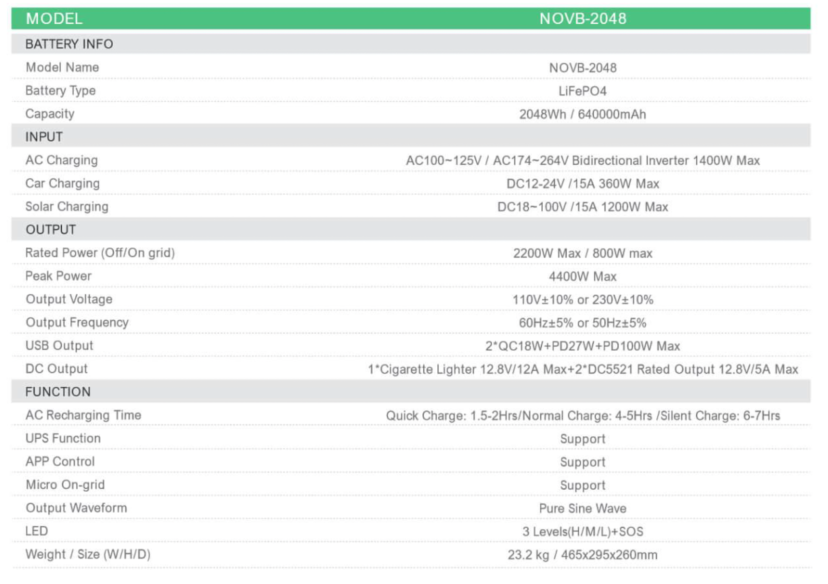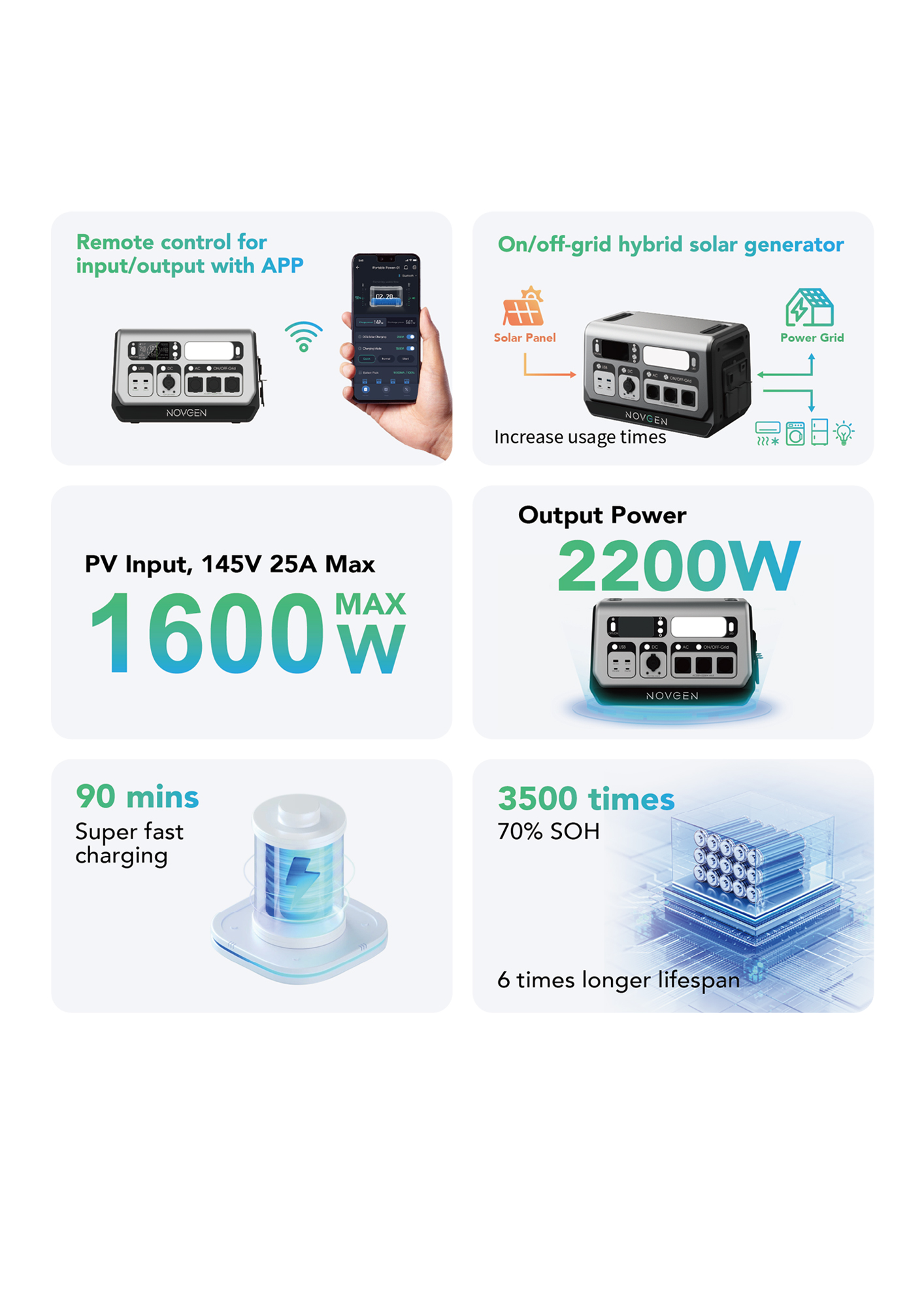 Ця електростанція поєднує акумулятор LiFePO4 на 2048 ват-годин із потужним виходом 2200 ват, пропонуючи універсальне рішення для автономного живлення в будинку.