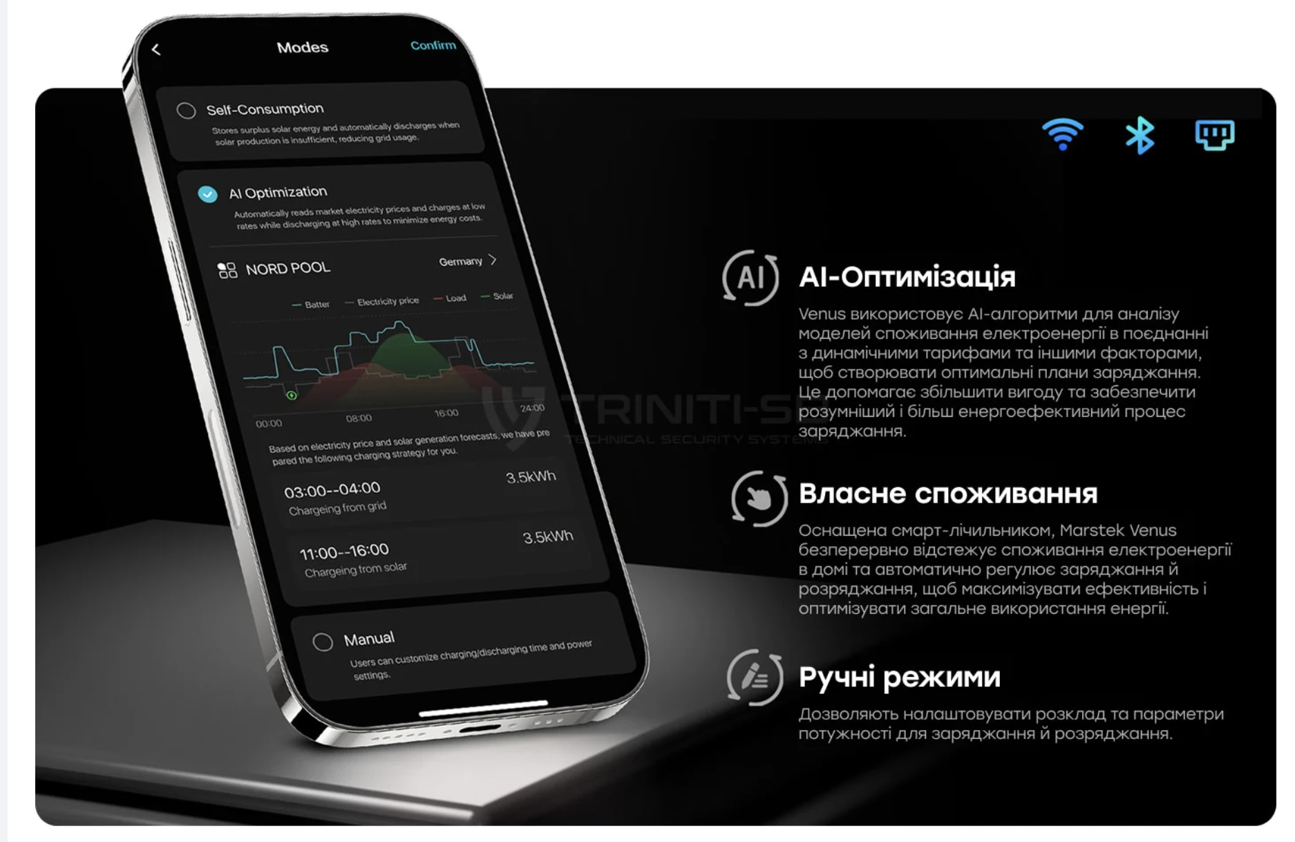 • Комунікація: Wi-Fi+Bluetooth+RS485 через водозахисний конектор для моніторингу.