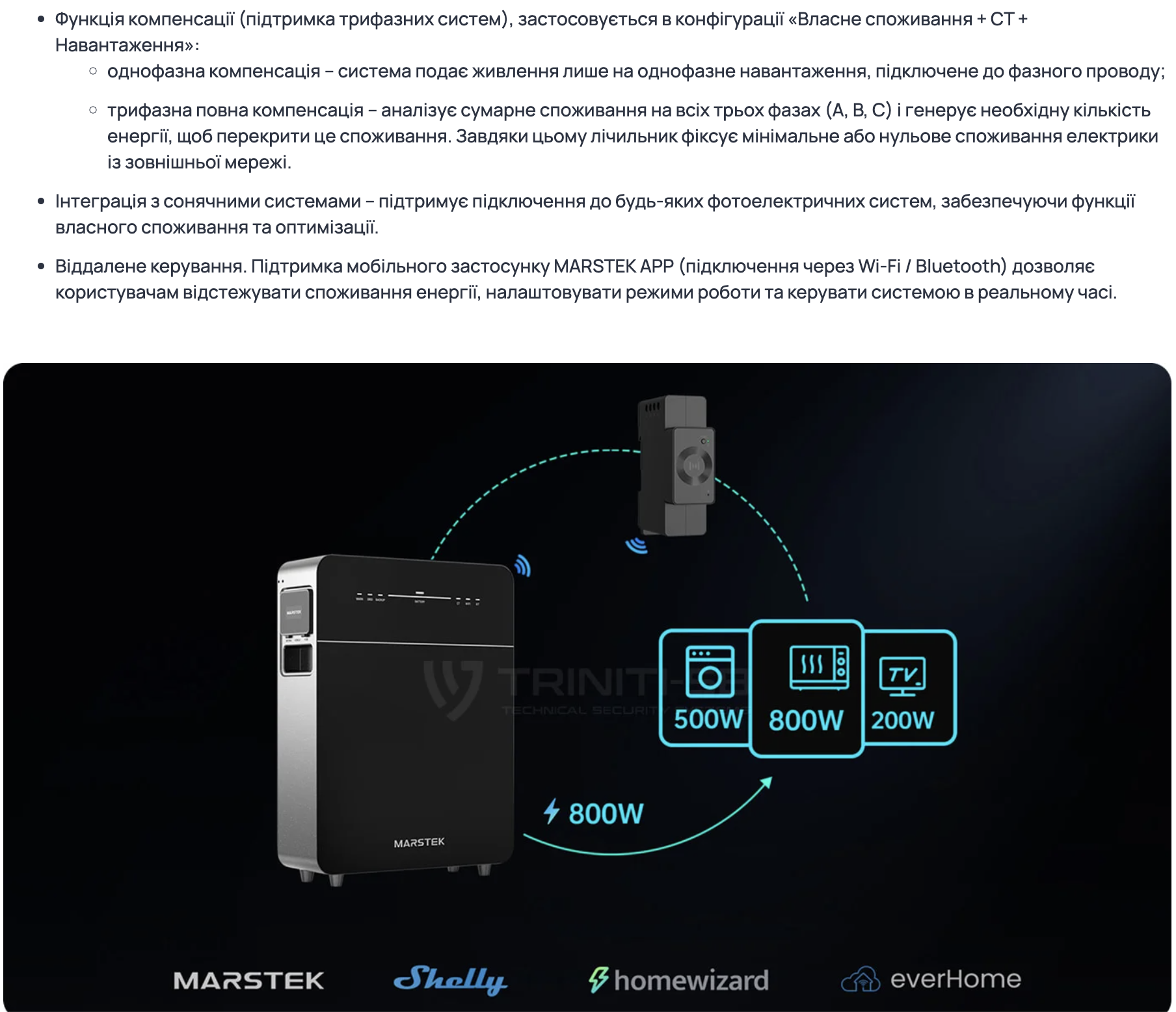 Пристрій ідеально сумісний з будь-якими сонячними панелями, запобігає зворотному потоку енергії в мережу та гарантує повне самовикористання, що допомагає максимально економити кошти завдяки алгоритмам штучного інтелекту. Підтримка розумних лічильників від виробника та інших брендів дозволяє точно моніторити споживання. Система підходить для резервного живлення всього будинку в однофазному або трифазному виконанні з можливістю паралельного з'єднання до трьох блоків на фазу для досягнення загальної потужності до 22,5 кВт та ємності 46,08 кВт·год.