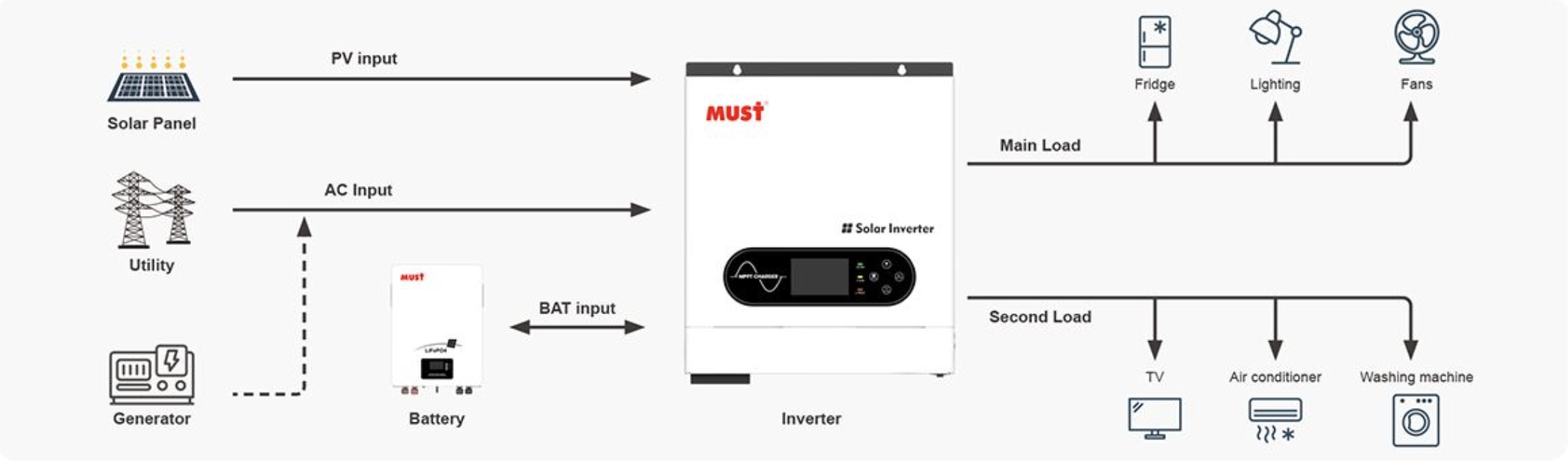 Модель здатна функціонувати без акумуляторних батарей, що знижує початкові витрати, при цьому максимальна напруга фотомодулів досягає 400 вольт для оптимального збору енергії. Розумні опції LCD дозволяють настроювати режими експлуатації, струм та напругу заряду, підлаштовуючи під конкретні сценарії. Подвійний вихід дає можливість розділяти навантаження на основне та вторинне, а інтеграція сонячних, мережевих та батарейних джерел гарантує стабільність навіть при збоях в електропостачанні.