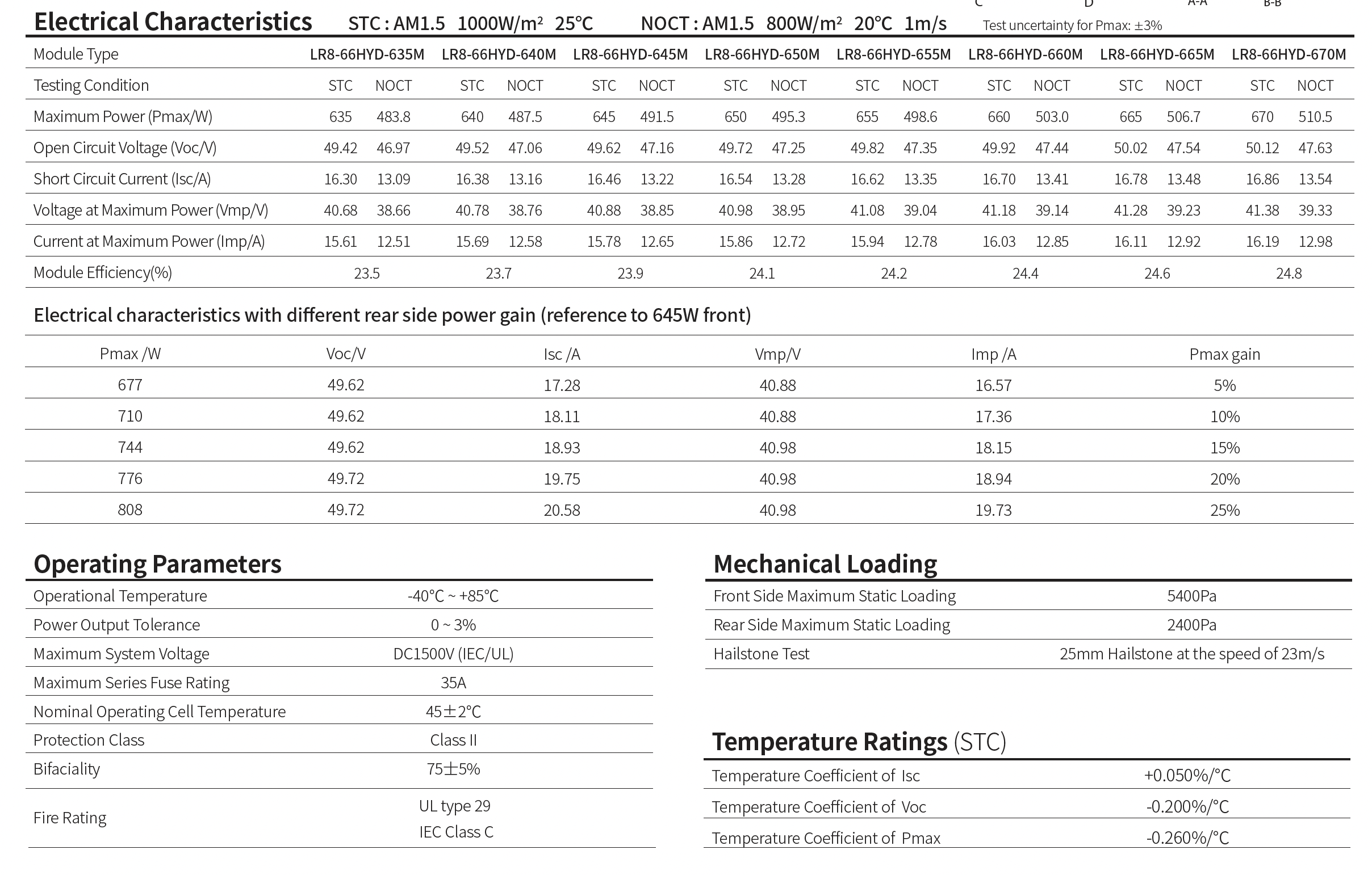 - Температурні коефіцієнти: Isc +0,050%/°C, Voc -0,200%/°C, Pmax -0,260%/°C.