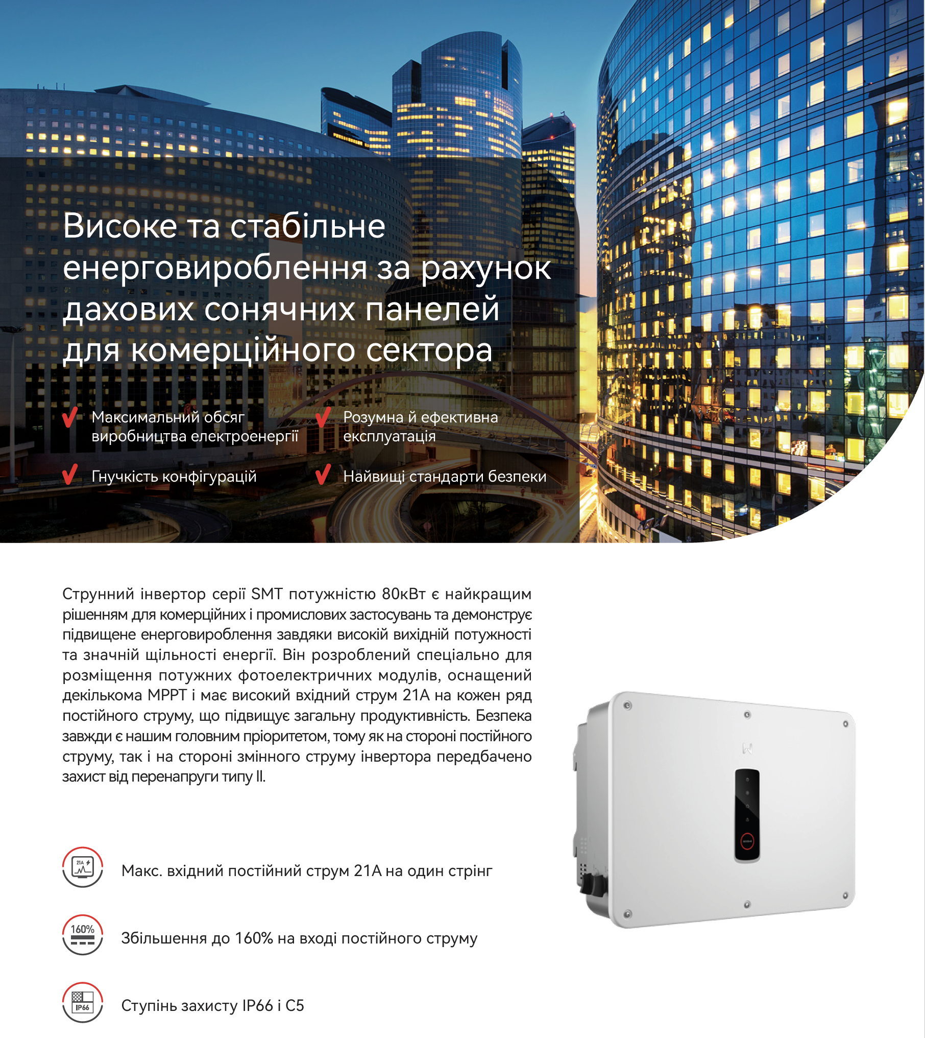80-кіловатний інвертор: техпідтримка українською мовою – цілодобово, швидка заміна – підмінний фонд у Євросоюзі. Потужний струнний перетворювач для комерційних цілей може справлятися з високими навантаженнями, інтегруючи кілька незалежних каналів відстеження максимальної потужності.