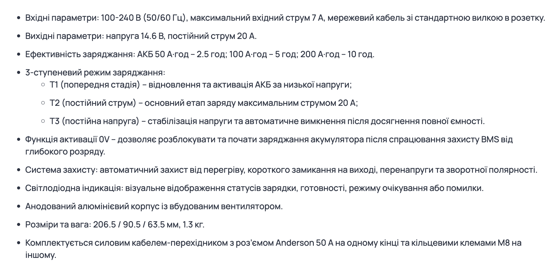 - Вихідний струм в максимумі дорівнює 20 амперам, забезпечуючи прискорену зарядку акумуляторів.