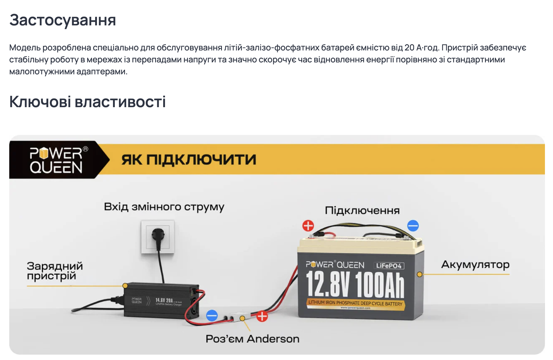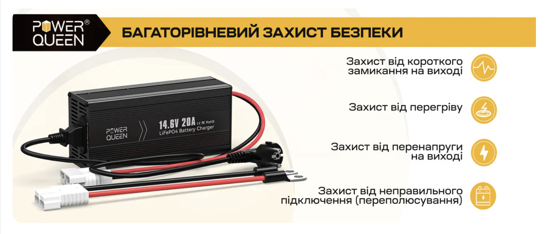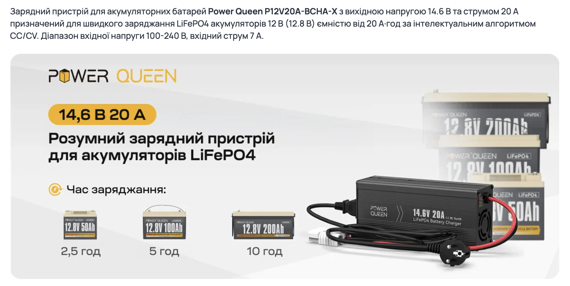 - Зарядний пристрій - бренд Power Queen (для LFP акумуляторів), модель P12V20A, версія BCHA-X